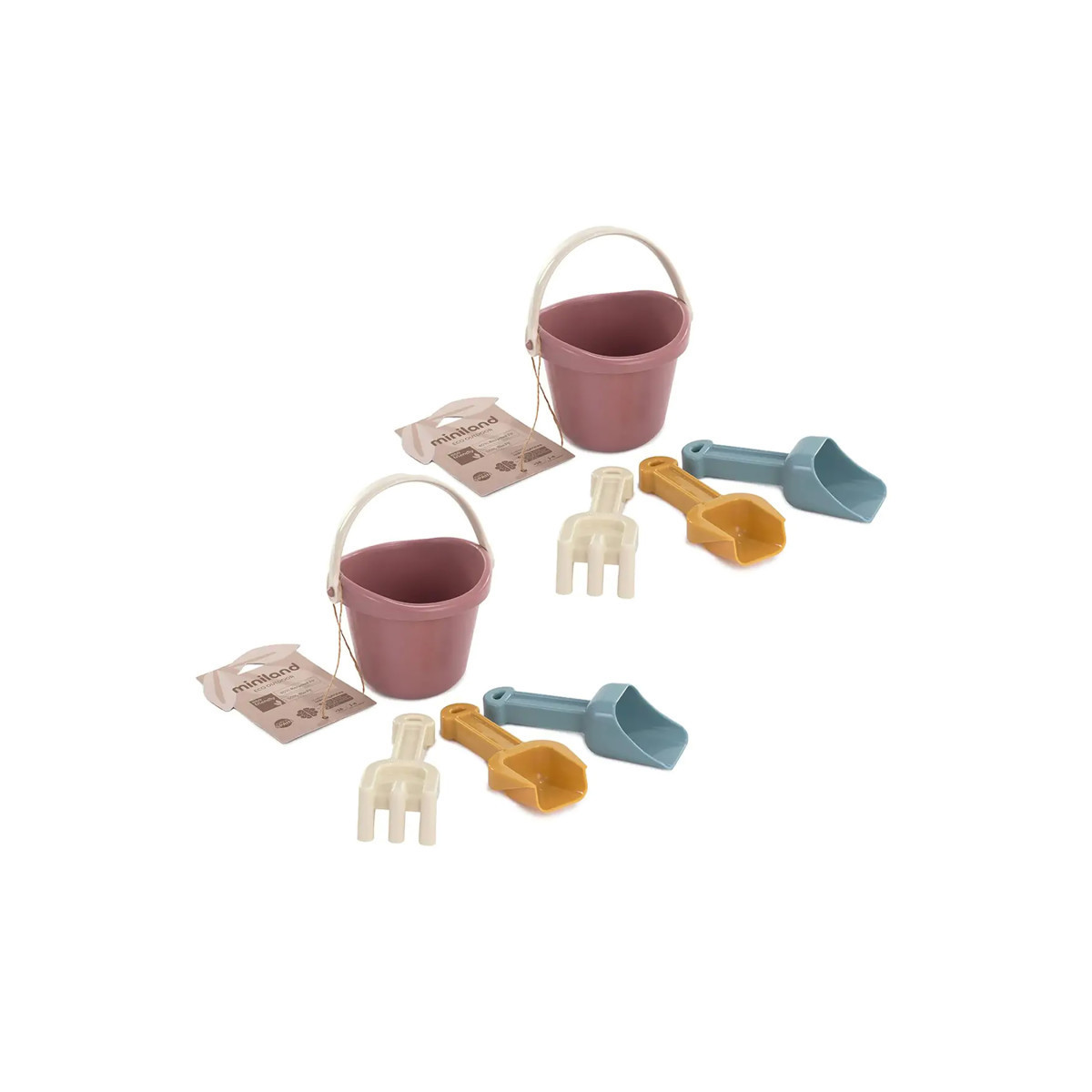 Each ECO Baby Sand Set in pastel colors includes a bucket, shovel, dustpan and rake.