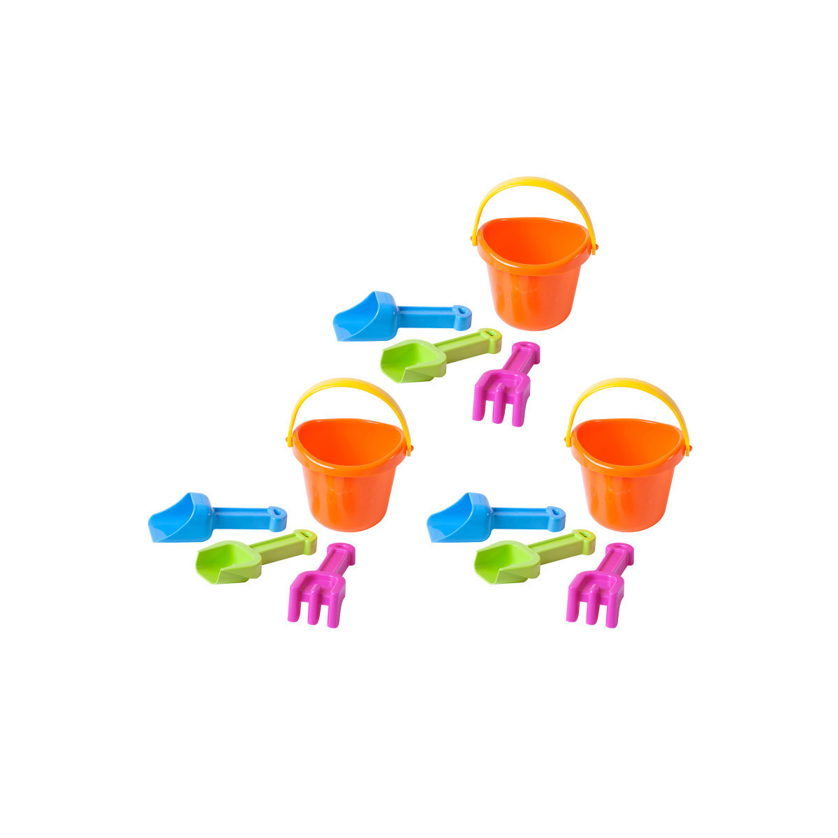 Sand set which includes a bucket, a scoop, a rake and a shovel. All parts can be stored in the bucket. Pieces adapted to the size of a baby's hand. Maximum strength and durability. Especially suitable for collective use. Sold as 3 sand sets.
