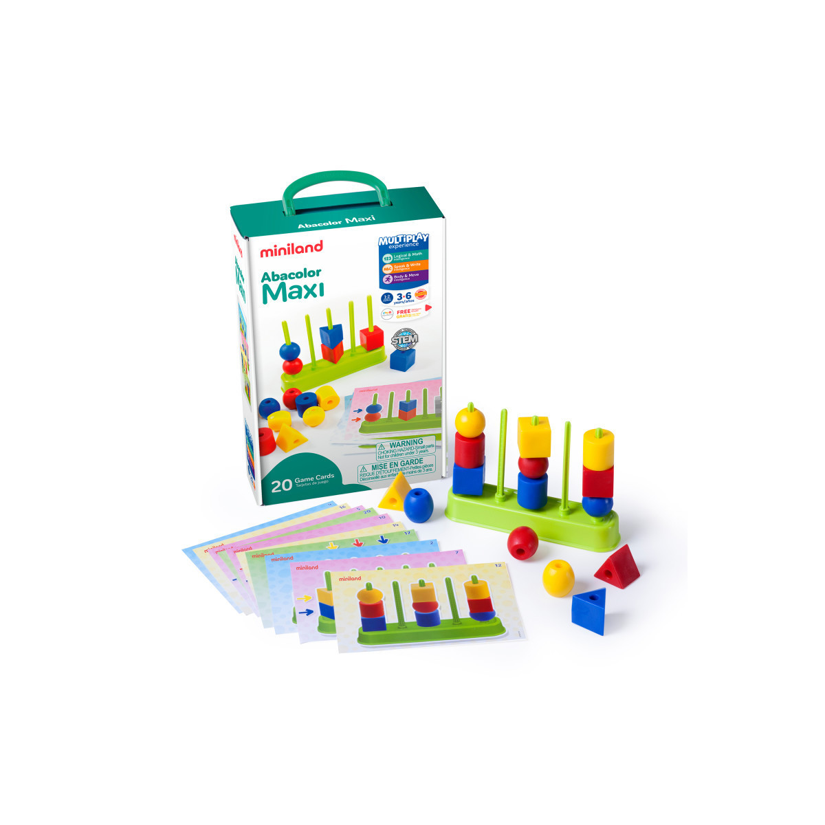 Children stack solid geometric blocks onto vertical rods to complete pattern challenges and sequencing activities using the included game cards. The hands-on design strengthens fine motor skills, hand-eye coordination, and spatial awareness while reinforcing early STEM concepts such as sorting, sequencing, counting, and logical reasoning.
