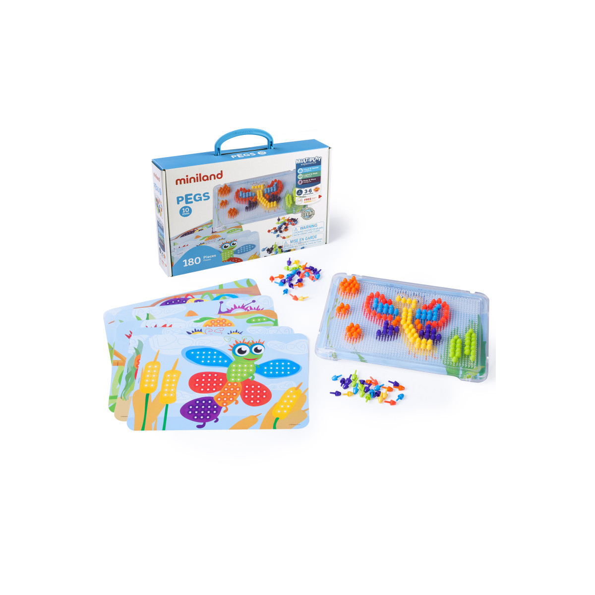 A classical game of mosaics that, with concentration exercises and attention, allows for the development of the visual-motor co-ordination, creativity, spatial orientation and the discrimination of colors. This perfect set of Pegs includes a board, 6 pattern cards and 180 Pegs. Board measures 12.25" x 8.25". Recommended age 3-6 years.