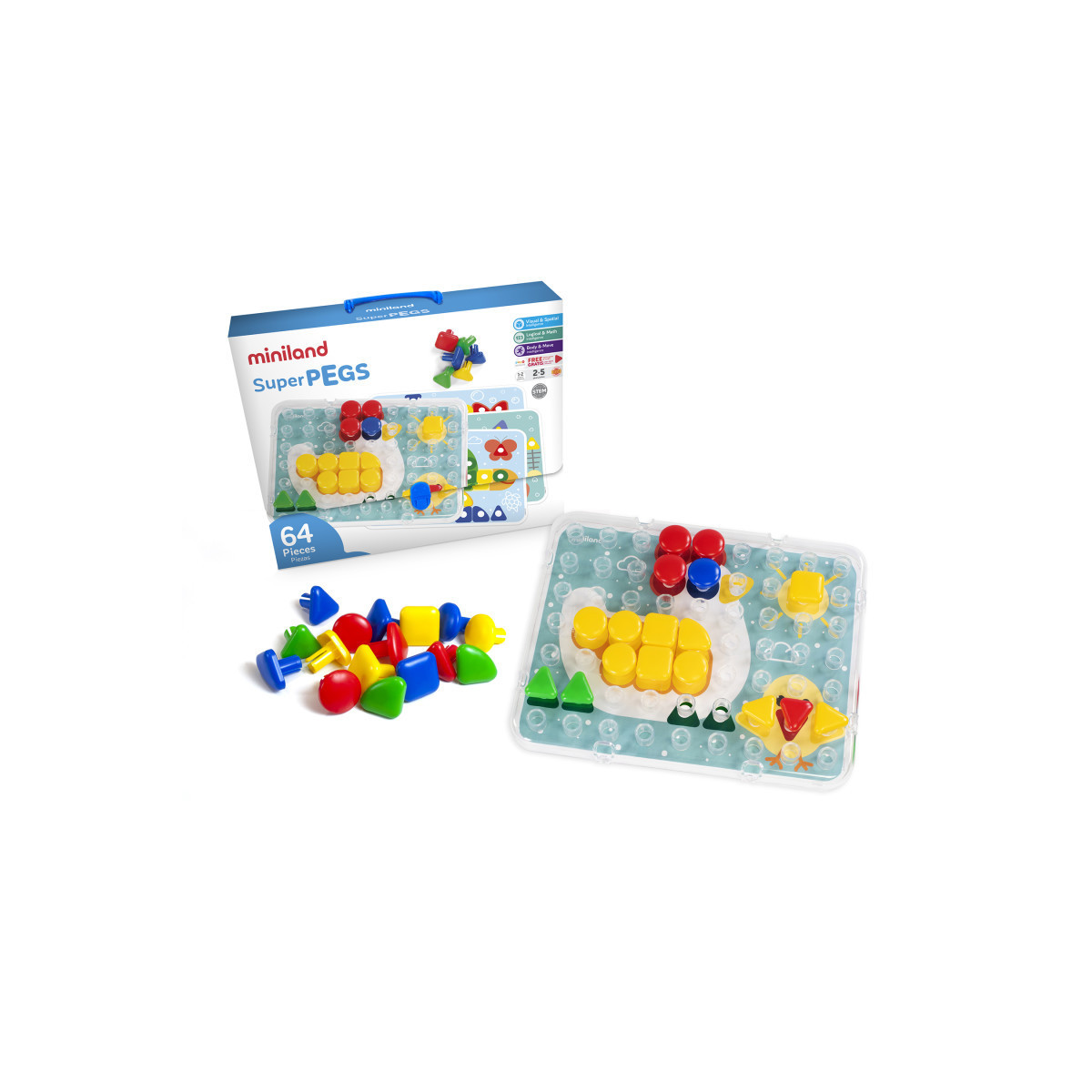 Perfect for small hands, these large pegs are easy to handle and affix to the pegboards. The 4 assorted peg shapes come in 4 primary colors. Provides lots of fun matching the pegs to the patterns. The Super Pegs encourage creativity while building motor, visual discrimination and cognitive skills. Each set includes 1 board, 4 pattern cards, and 64 pegs. Board measures 15" x 11.75". Recommended age 2-5 years.