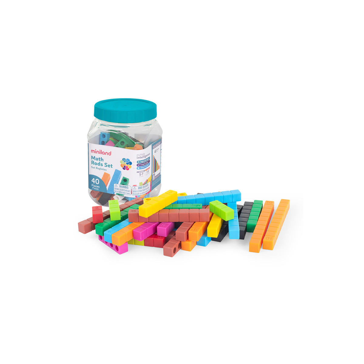 Basic set of rods to teach children the fundamentals of mathematical logic. It includes 4 complete sets of rods from 1 to 10. Each section corresponds to 1 cm, reaching 10 cm in the largest rod. It is based on the Cuisenaire method and it is made in Spain.