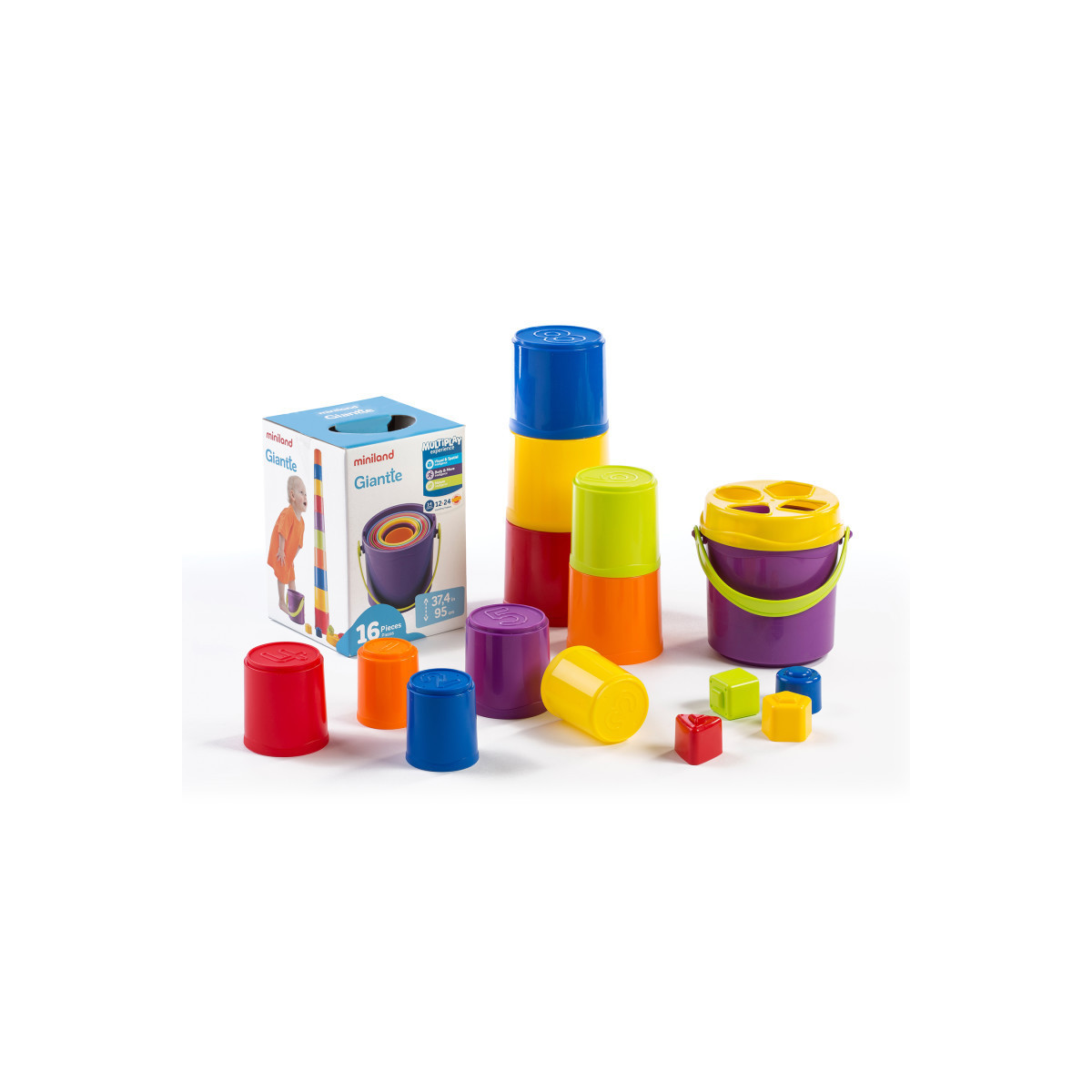Giant stacking and nesting game formed by 10 progressively sized cups. Each cup has a number in relief - making it easy to stack in order The largest cup has a perforated cover with the silhouettes of the 4 different Shapes. The 4 shaped blocks to match and insert through the cover are included in the set. Promotes eye-hand coordination as well as counting. 36 inches high