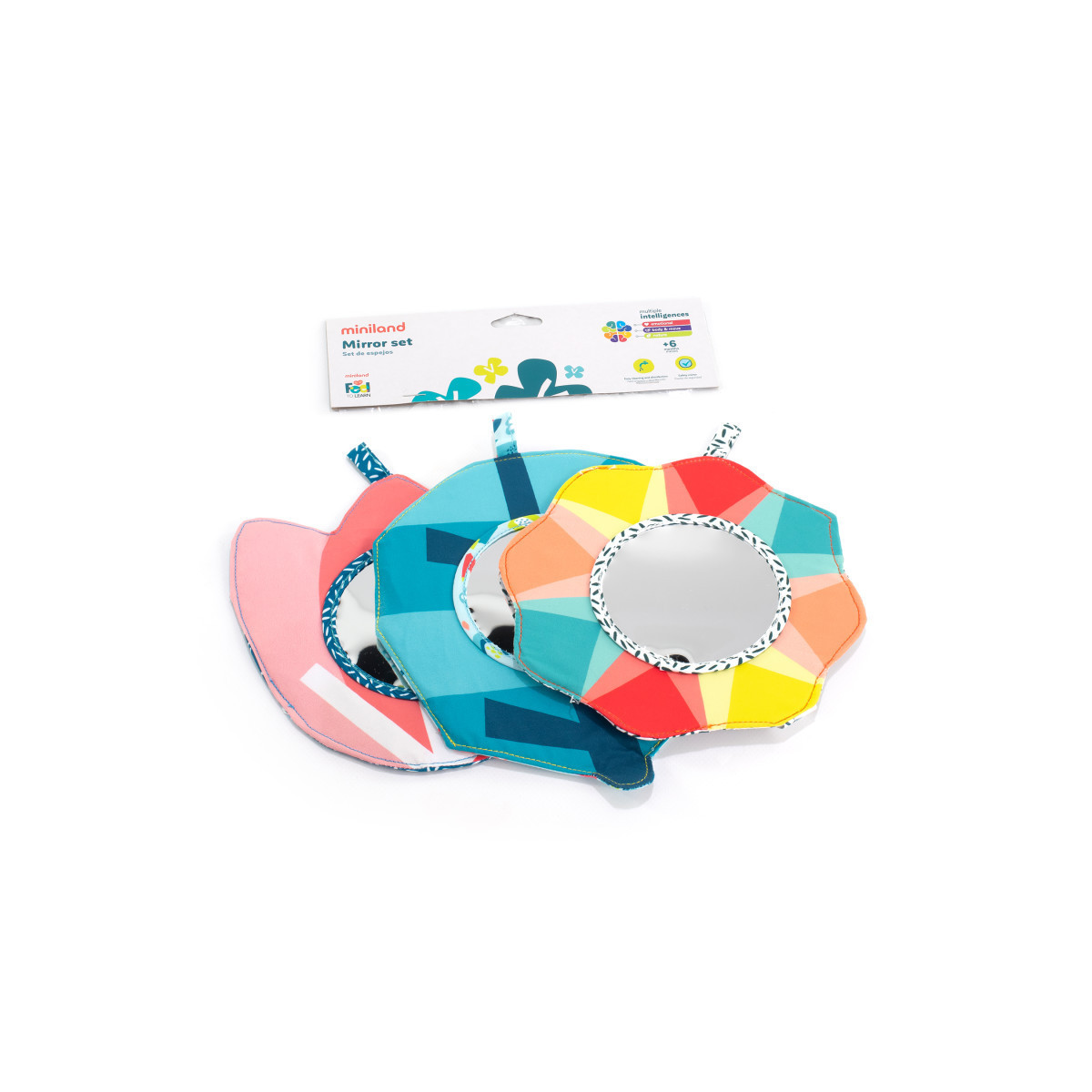 A game composed of three soft safety mirrors in different natural shapes. With high-contrast color designs that stimulate the sense of sight, and thanks to their crinkly paper inside, they stimulate the senses of hearing and touch. Great for active play.