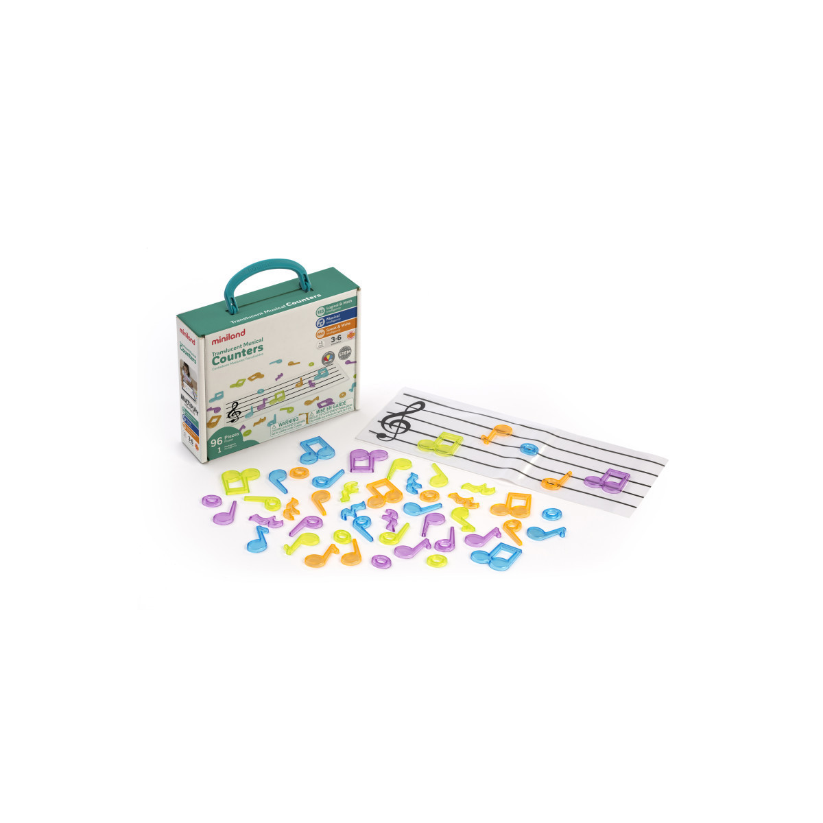 A set of translucent counters in various colors in the form of musical notes. With this game, boys and girls will learn in a fun way how to recognize, differentiate and classify the main musical notes. It includes a transparent pentagram, which is very useful when introducing kids to musical language. Suitable for playing on light tables. Great accessory for light tables. Sensory game. Measures 5" (H).