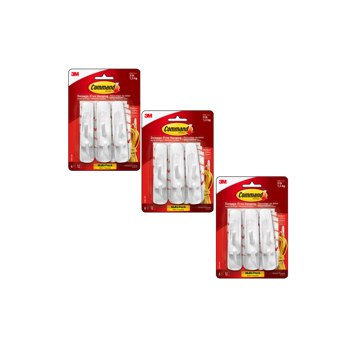 HOLDS UP TO 3 POUNDS: Sold as 3 packs, each package of the Command Medium Utility Hooks includes 6 wall hooks and 12 adhesive strips; each adhesive wall hook can hold up to three pounds