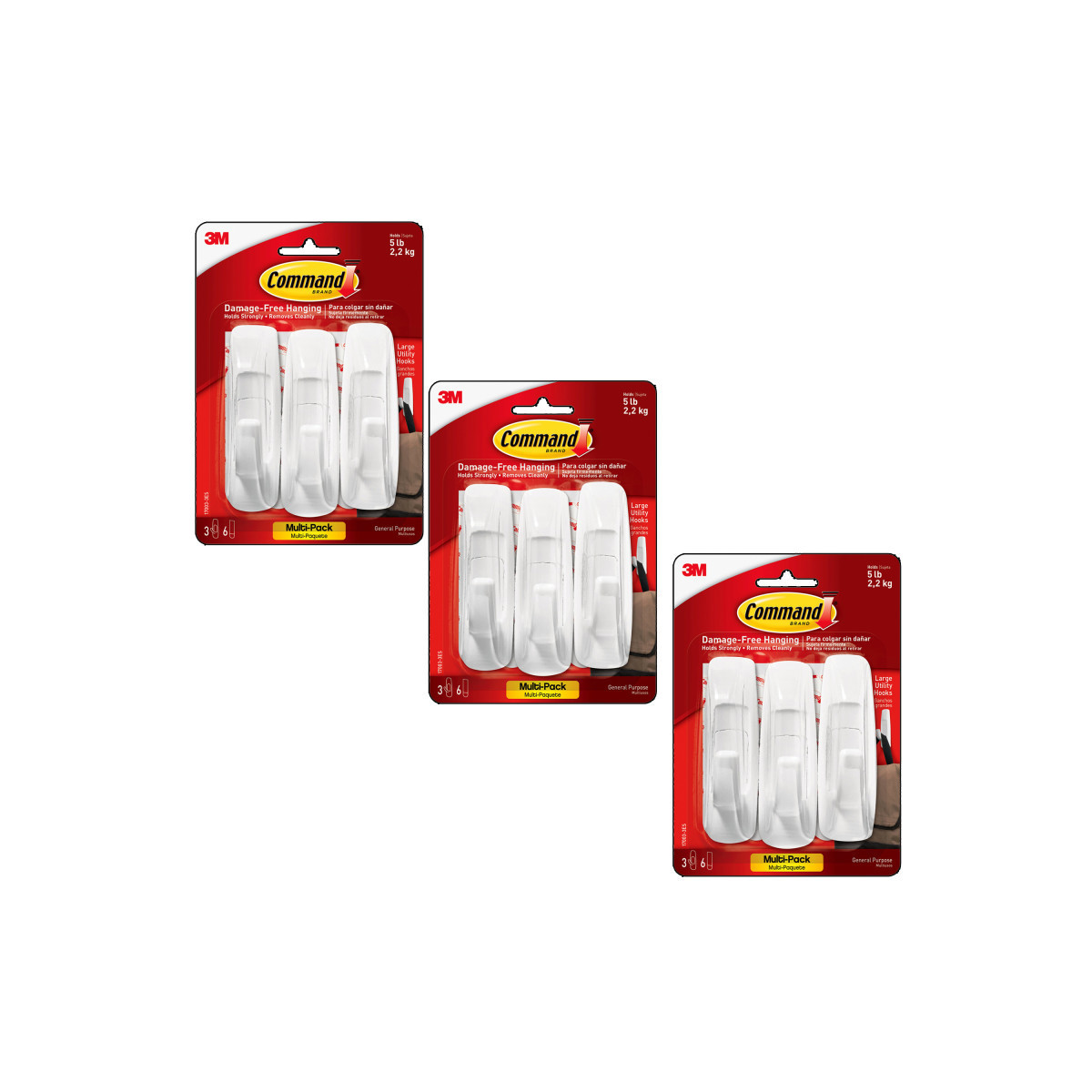 HOLDS UP TO 5 POUNDS: Sold as 3 packs, each package of the Command Large Utility Hooks includes 3 large utility hooks and 6 large adhesive strips; each adhesive wall hook can hold up to 5 pounds