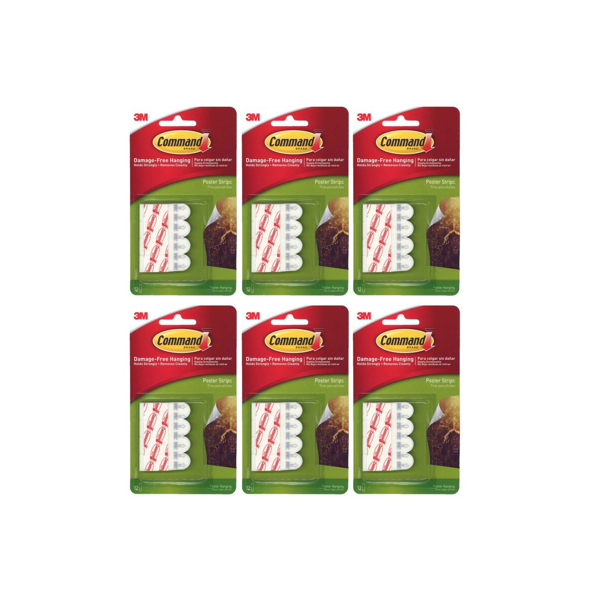 Command Poster Strips make decorating quick and easy. They're perfect for hanging schedules, posters, calendars and pictures without frames, or as an alternative to double-sided tape. They hold strongly to wood, tile, metal and painted surfaces, yet remove cleanly - leaving behind no holes, marks, sticky residue or stains. Each strip measures approximately 1-3/4" x 5/8" x 1/32". Weight Capacity: 1 Pound. Color: White. Each pack contains 12 strips. Sold as 6 packs for a total of 72 strips.
