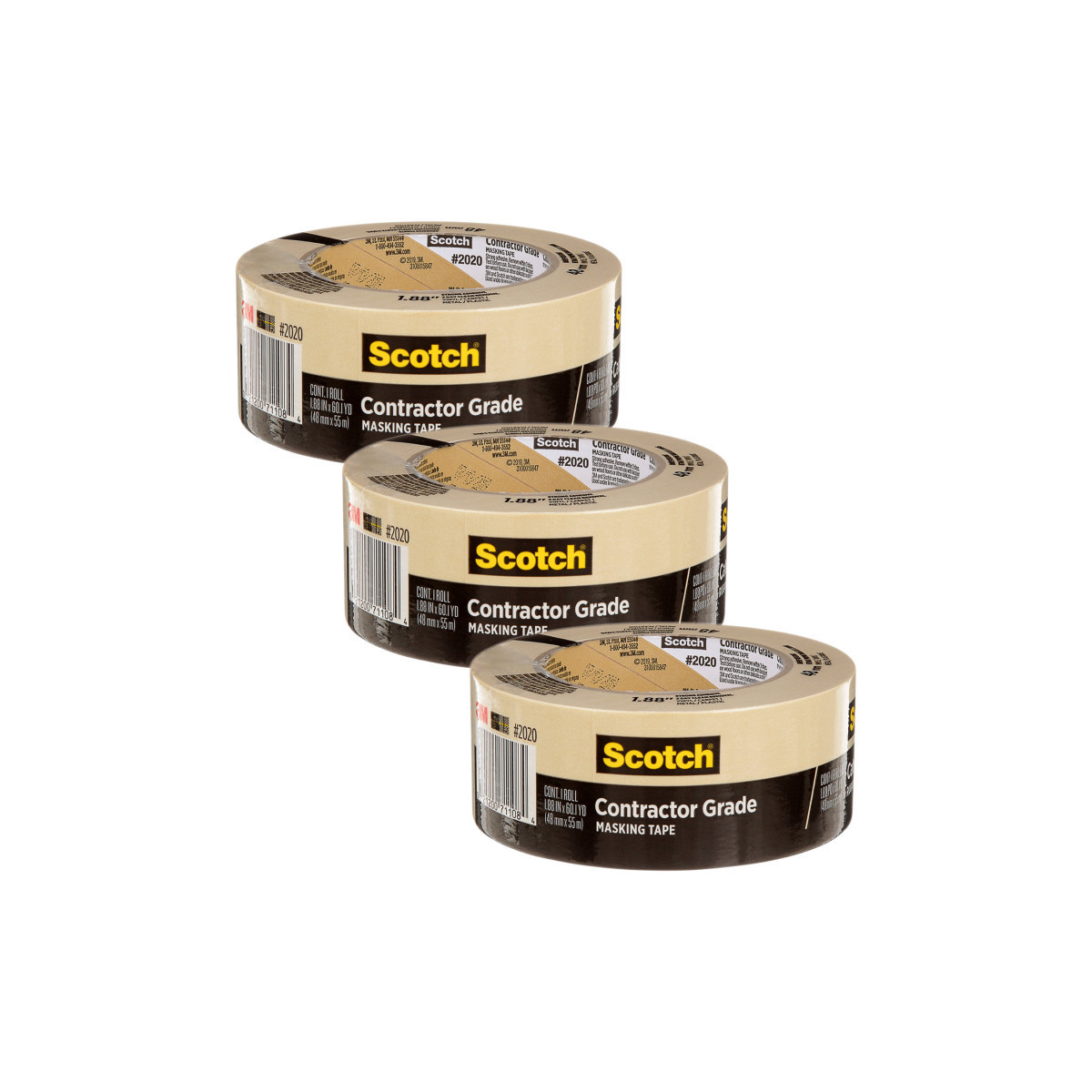 Scotch Contractor Grade Masking Tape is a general purpose masking tape designed for use on non-damageable surfaces. Use on vinyl, carpet, metal, and plastic for the protection you need to get the job done. Scotch Contractor Grade Masking Tape holds to surfaces for up to 3 days and then removes easily without leaving any sticky residue behind. Sold as a pack of 3 rolls.