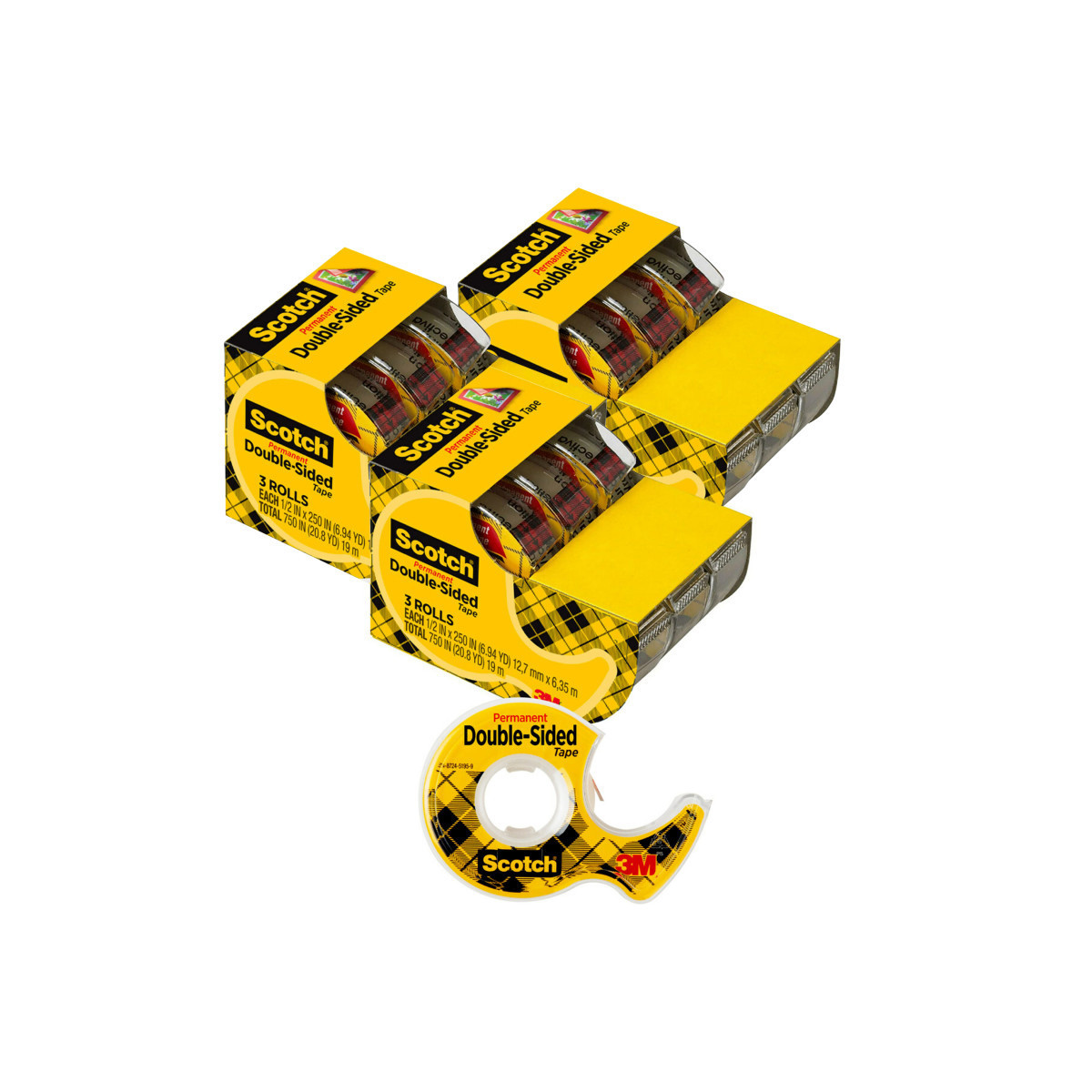 For the light duty attaching you do for activities around the house, get it done fast and get it done right without the drips, clogs and air bubbles of glue. Scotch® Double Sided Tape the neat, clean, strong and long lasting way to take care of school projects, scrapbooks, photo albums all those important presentations that need to come together. Scotch® Double Sided Tape is easy to use and won't create a mess like the way glue does. It smoothly glides off the easy to use Scotch® Tape dispenser (included), cuts cleanly and right where you want to cut so no waste. For a better way to present all the wonderful things in life. Each pack includes 3 rolls of tape on dispensers. Sold as 3 packs for a total of 9 rolls of tape.