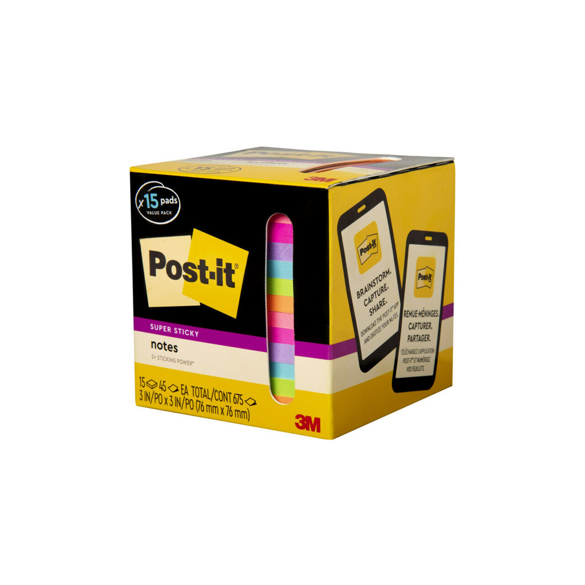Post-it® Super Sticky Notes in 3 in. x 3 in. feature 2x the sticking power. Unique adhesive reliably sticks and re-sticks so your message can stay front and center. Move your notes with you throughout the day. Use for notes or reminders on doors, windows or walls. Bright colors are ideal to help your message and reminder stand out, and the large pack is great to organize any work area or project. The compact container has a small space to save room in your drawers or cabinet. Post-it® Super Sticky Notes are recyclable and the paper in Post-it® Super Sticky Notes is sourced from certified, renewable and responsibly managed forests. 15 Pads/Pack, 45 Sheets/Pad.