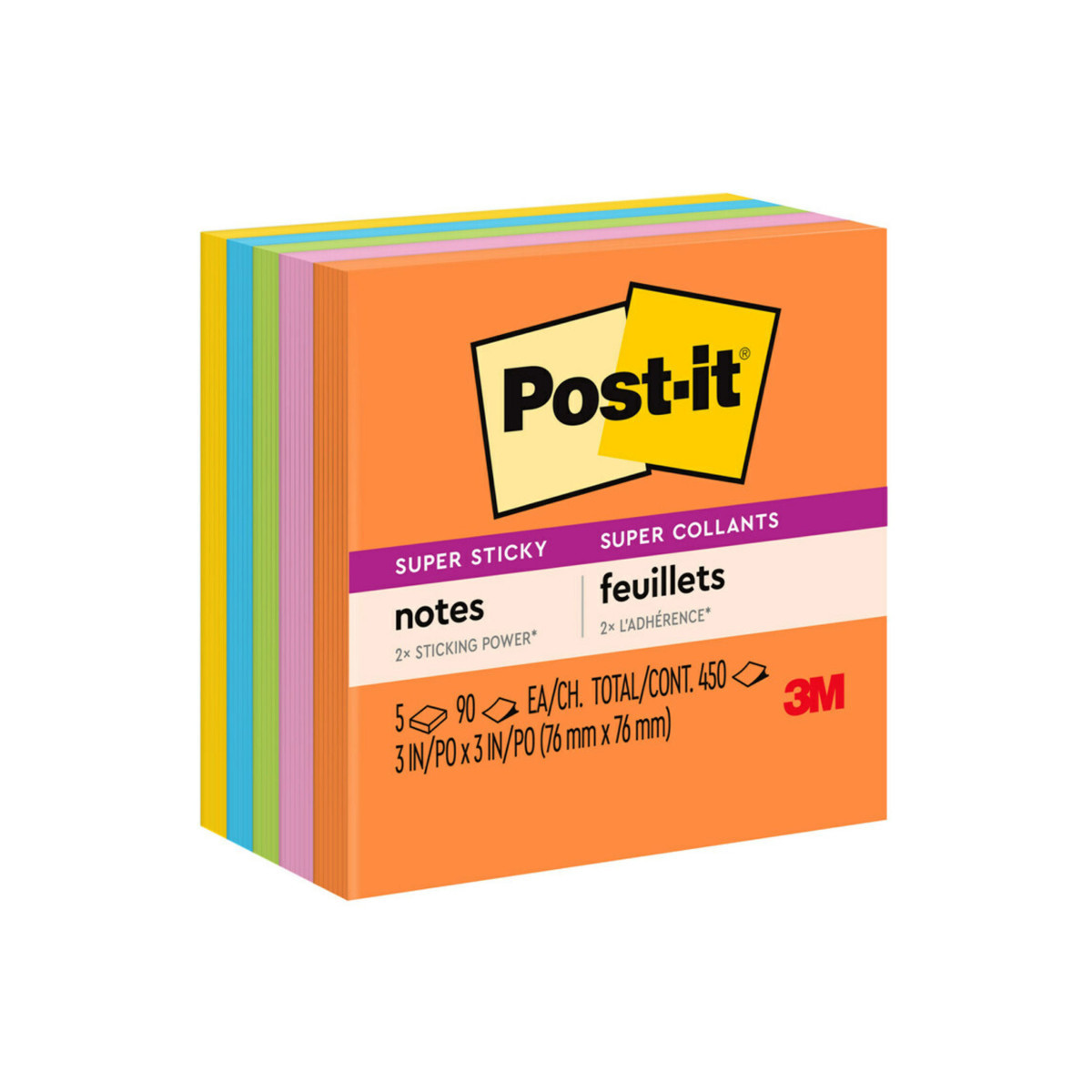 Post-it® Super Sticky Notes in 3 in x 3 in feature 2x the sticking power. Use for notes or reminders on doors, windows or walls. Unique adhesive reliably sticks and re sticks so your message can stay front and center. Move your notes with you throughout the day. Vibrant, spirited colors brighten your mood and messages in the Energy Boost collection. Post-it® Super Sticky Notes are recyclable and the paper in Post-it® Super Sticky Notes is sourced from certified, renewable and responsibly managed forests. 5 Pads/Pack, 90 Sheets/Pad.