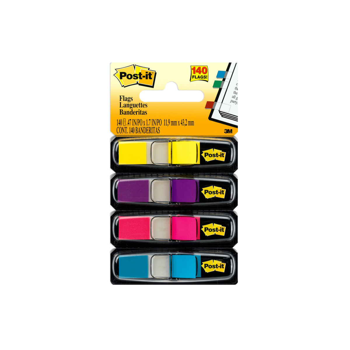 Post it® Highlighting Flags in assorted Bright colors and .47 in. wide size saves you from missing an important detail or item. Strong adhesive makes flags stay put and lets you reposition them as well. The dispenser makes one handed dispensing easy to help keep you on track. Contains 35/dispenser and 4 dispensers/pack.