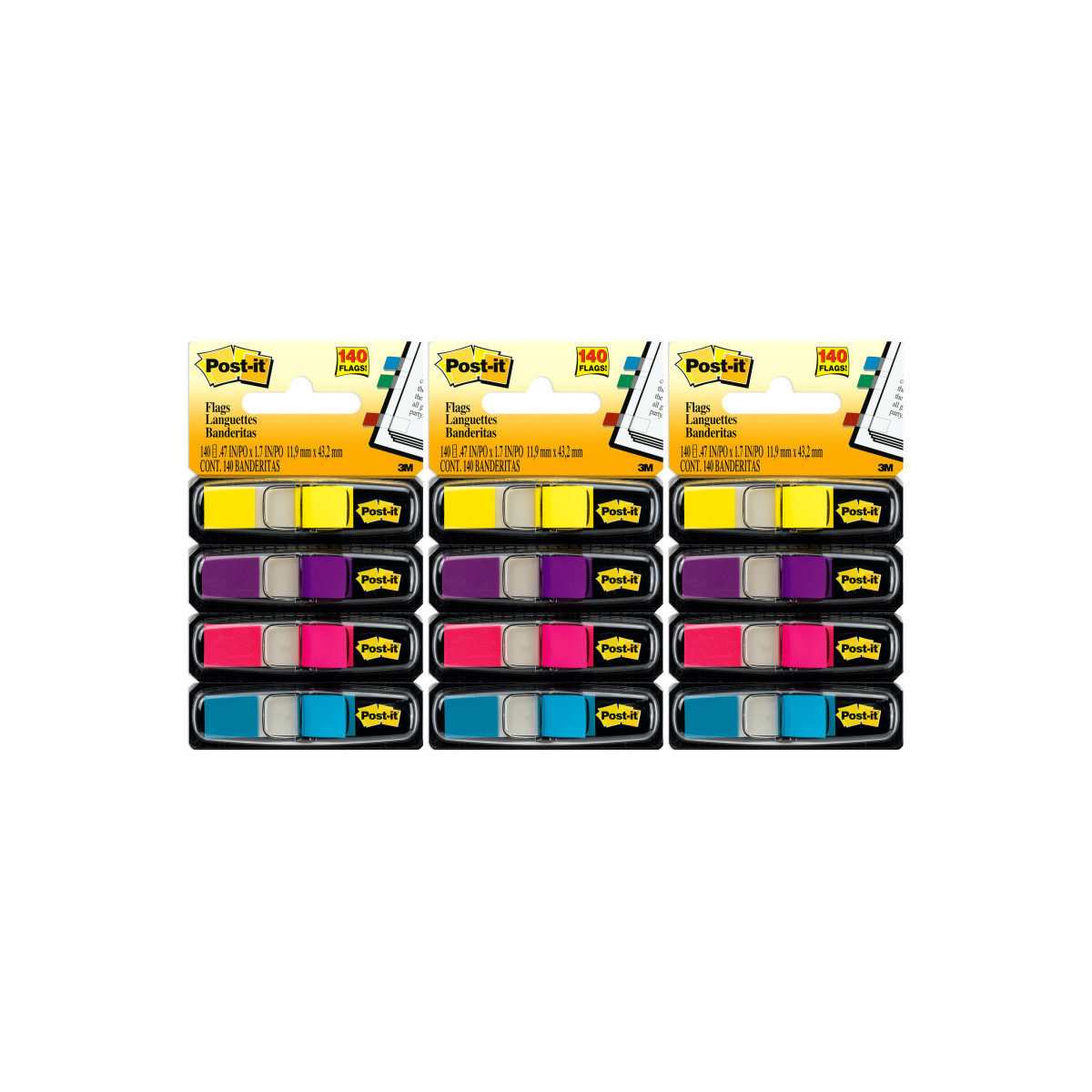 Post it® Highlighting Flags in assorted Bright colors and .47 in. wide size saves you from missing an important detail or item. Strong adhesive makes flags stay put and lets you reposition them as well. The dispenser makes one handed dispensing easy to help keep you on track. Each pack includes 4 dispensers (35 flags/dispenser). Sold as 3 packs for a total of 12 dispensers (420 flags).