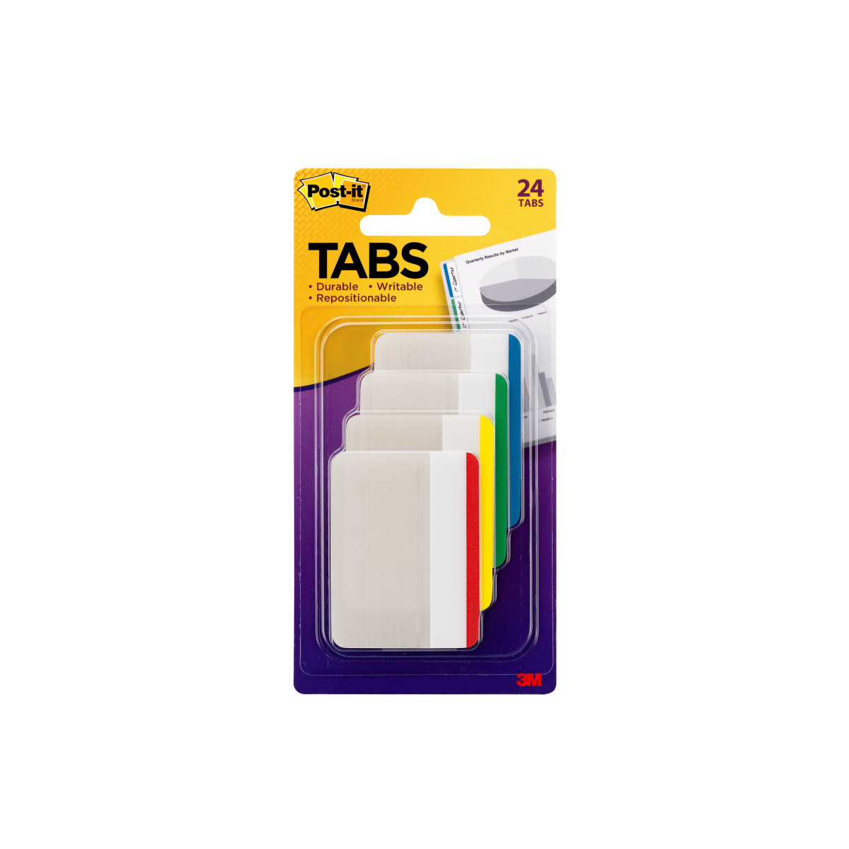 Post it® Tabs in 2 inch size create necessary order by easily organizing file folders. Lined color bars give you flexibility to organize by color. They are durable, you can write on them, and reposition as needed. They are also great for planners, notebooks and file folders. They stick securely and remove cleanly. Assorted primary colors. Contains 6 tabs/color, 4 colors, 24 tabs/pack.