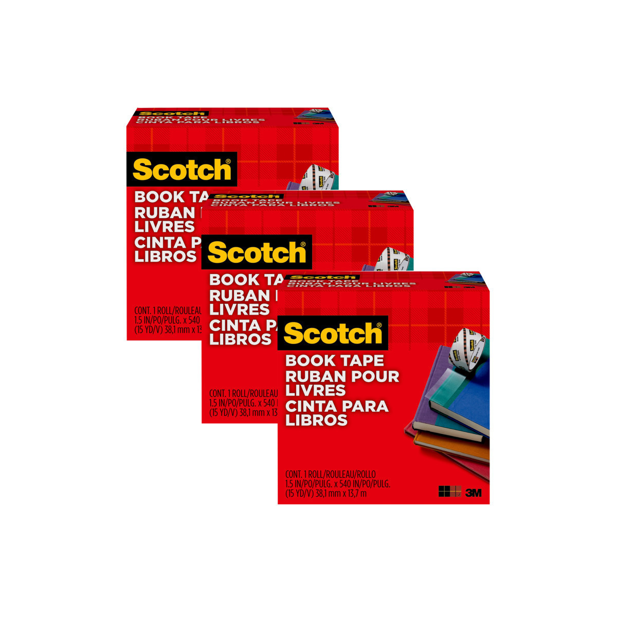 Scotch Book Tape is excellent for repairing, reinforcing, protecting and covering bound edges and surfaces. Transparent, conformable and permanent. Unwinds easily. Use on books, magazines, pamphlets, record album jackets and more. Each roll measures 1-1/2 in x 15 yd, with a 3 in. core. Sold as a pack of 3 rolls of book tape.