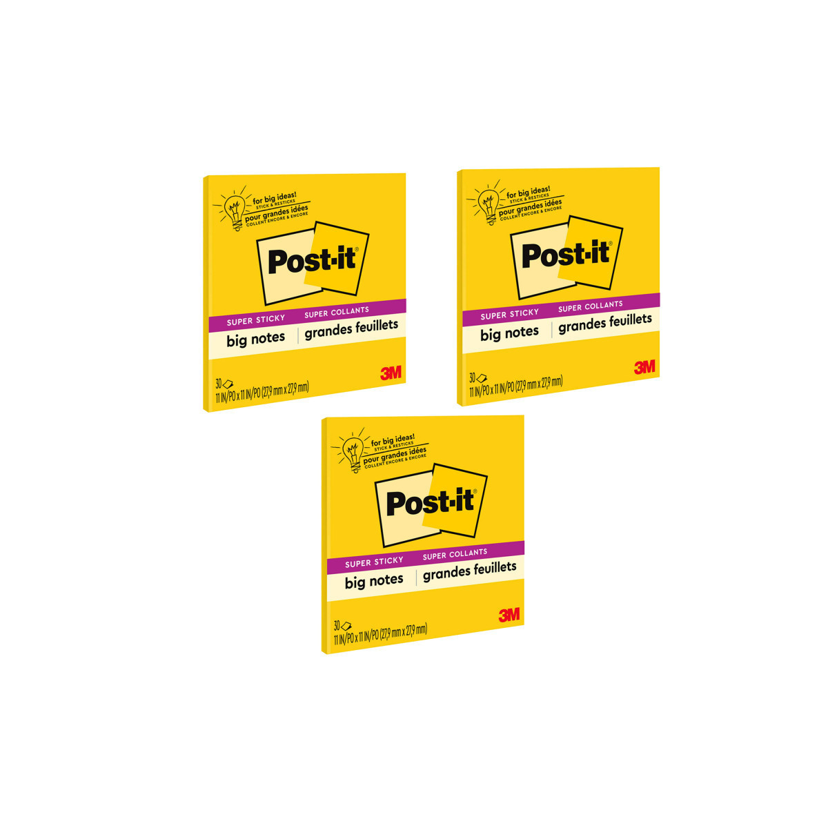 Think Big! Ignite your creativity with Post-it® Super Sticky Big Notes. These bright and colorful pads are designed to help you visualize your ideas with sheets that can be displayed on smooth, vertical surfaces. Large in size, yet easily portable. Use Post-it® Super Sticky Big Notes to bring your big ideas to life. Sheets measure 11" x 11". Each pad has 30 self stick sheets. Sold as a pack of 3 pads.