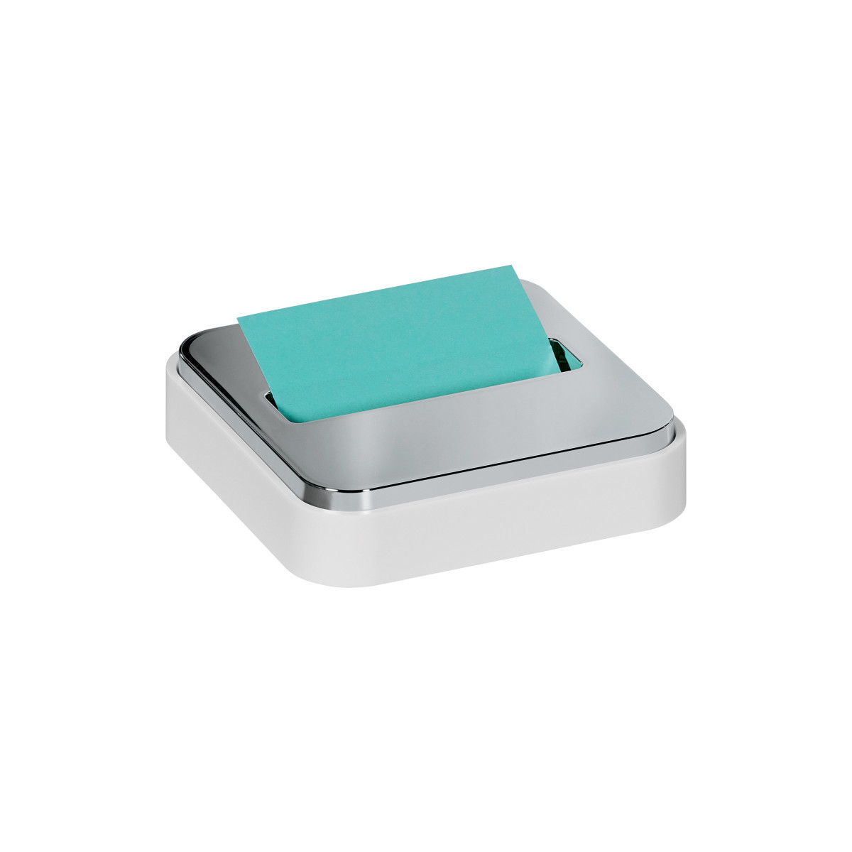 Metallic top dispenser with white base holds 3 in x 3 in Dispenser Notes