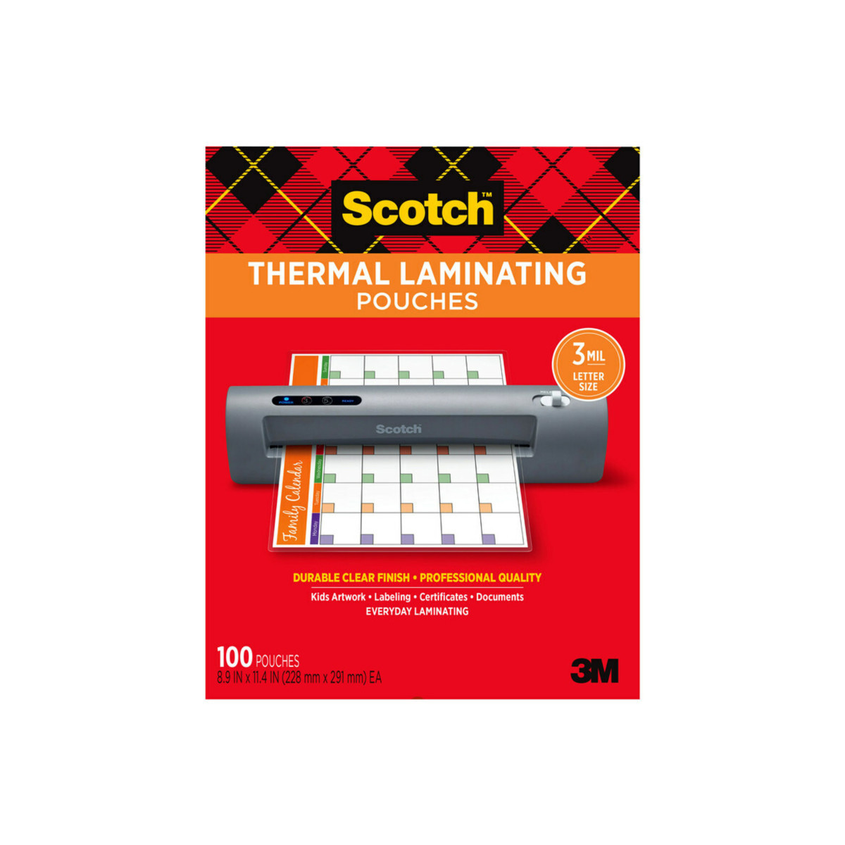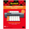 Scotch™ Thermal Laminating Pouches protect documents that you use frequently. Protects and adds professionalism to business documents. Great for signs, flyers, schedules, certificates, to-do lists, and other frequently used documents. Ultra clear to let important information show through. Ideal for marker-proof, tear-proof and spill-proof paper items that you want to last in the home, office or classroom. Recommended to use with Scotch™ Thermal Laminators. 3mil Size. Pack of 100.