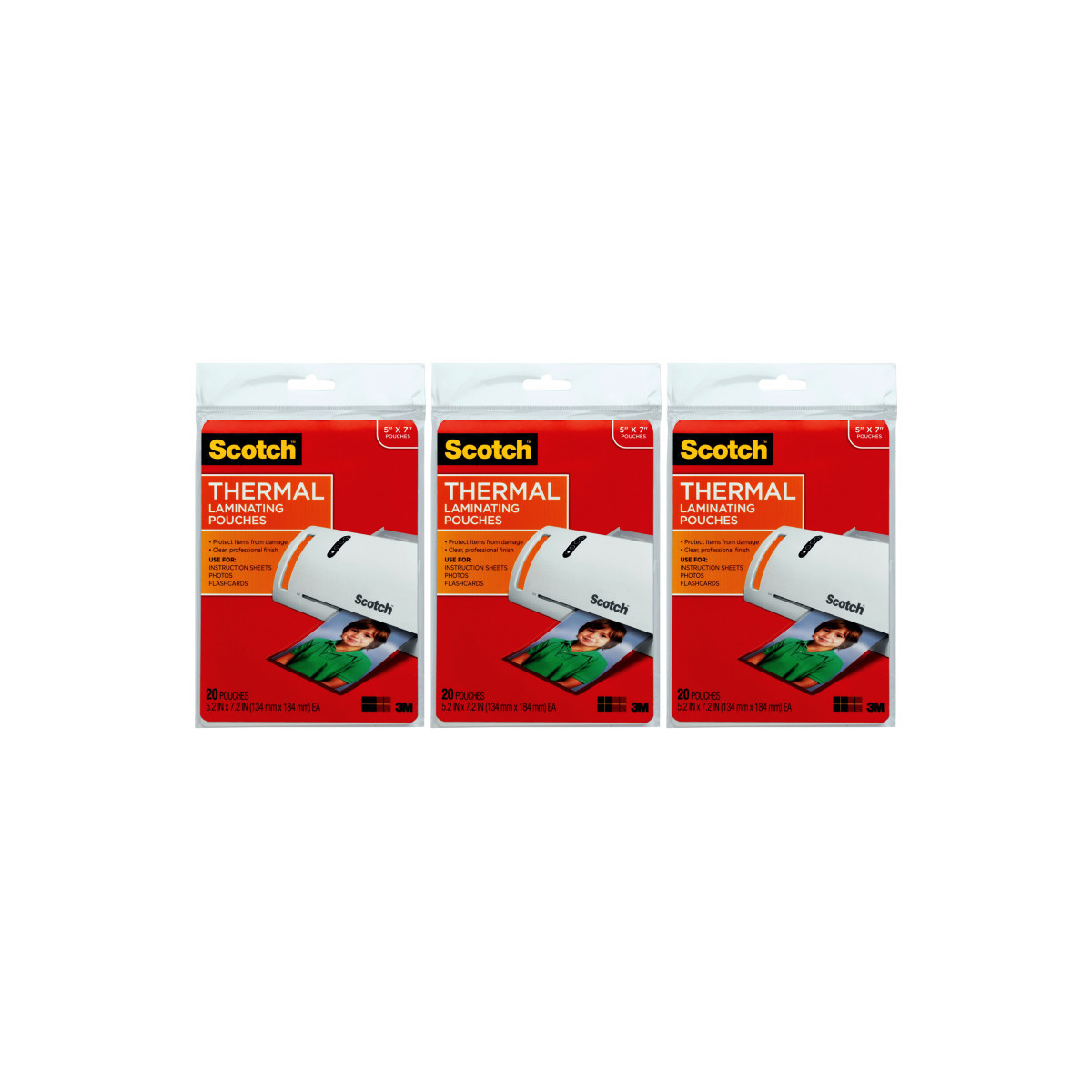 Scotch™ Thermal Laminating Pouches protect items from damage and are for use with thermal laminators. These 5 mil thick pouches are great for a very sturdy and more durable finish. Protects and adds professionalism to business documents. Great for signs, flyers, schedules, certificates, to-do lists, and other frequently used documents. Ultra clear to let important information show through. Ideal for marker-proof, tear-proof and spill-proof paper items that you want to last in the home, office or classroom. Recommended to use with Scotch™ Thermal Laminators. 5mil size. 5" x 7". Each pack includes 20 pouches. Sold as 3 packs for a total of 60 pouches.