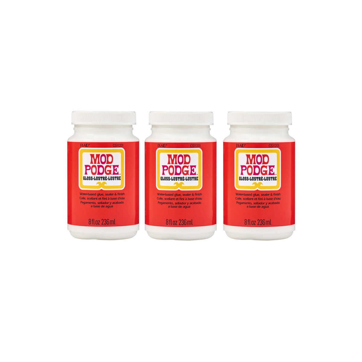 For over 55 years Mod Podge has been America's favorite glue, sealer, and finish. Mod Podge Gloss is quick-drying and dries clear, leaving a smooth, glossy finish. Preserve the beauty of your decoupage paper projects and more with this multi-purpose, all-in-one sealant, glue, and finish. Use this decoupage glue to create decoupage tissue paper projects as well as projects using wood, fabric, plastic, and canvas! This handy decoupage glue comes in a variety of finishes such as gloss, matte, glitter, satin, outdoor, dishwasher safe, and many other unique formulas for every project. Let your creativity come alive with the limitless possibilities of Mod Podge Gloss. Sold as a pack of three 8 oz. bottles of Modge Podge Gloss.