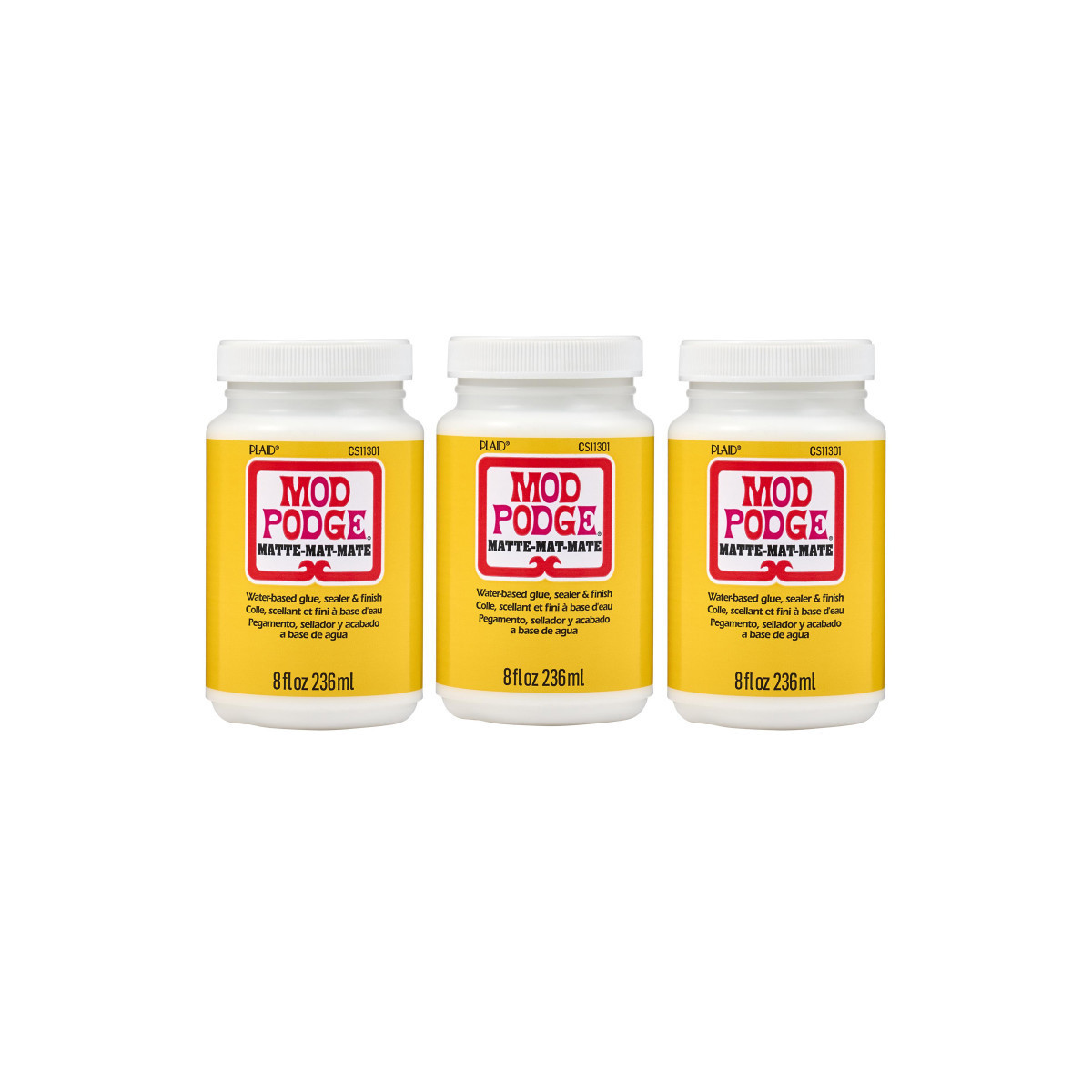 For over 55 years Mod Podge has been America's favorite glue, sealer, and finish. Mod Podge Matte is quick-drying and dries clear, leaving a smooth, matte finish. Preserve the beauty of your decoupage paper projects and more with this multi-purpose, all-in-one sealant, glue, and finish. Use this decoupage glue to create decoupage tissue paper projects as well as projects using wood, fabric, plastic, and canvas! This handy decoupage glue comes in a variety of finishes such as gloss, matte, glitter, satin, outdoor, dishwasher safe, and many other unique formulas for every project. Let your creativity come alive with the limitless possibilities of Mod Podge Matte. Sold as a pack of three 8 oz. bottles.