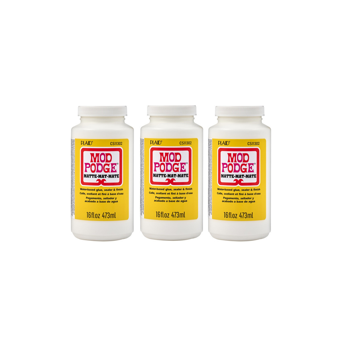 For over 55 years Mod Podge has been America's favorite glue, sealer, and finish. Mod Podge Matte is quick-drying and dries clear, leaving a smooth, matte finish. Preserve the beauty of your decoupage paper projects and more with this multi-purpose, all-in-one sealant, glue, and finish. Use this decoupage glue to create decoupage tissue paper projects as well as projects using wood, fabric, plastic, and canvas! This handy decoupage glue comes in a variety of finishes such as gloss, matte, glitter, satin, outdoor, dishwasher safe, and many other unique formulas for every project. Let your creativity come alive with the limitless possibilities of Mod Podge Matte. Sold as a pack of three 16 oz. bottles.