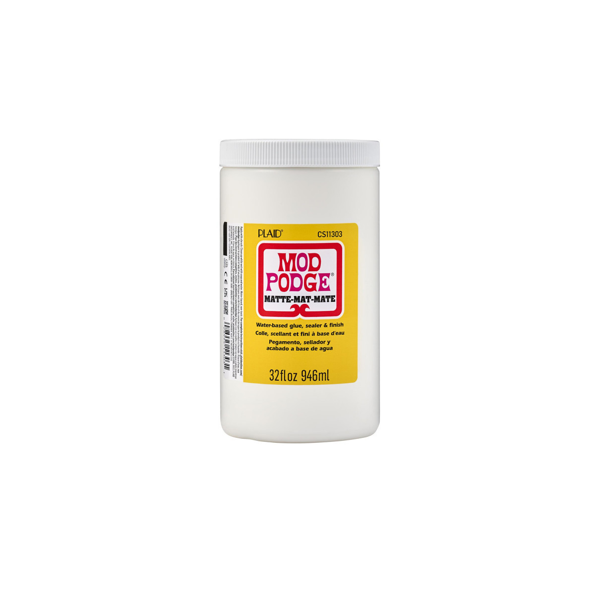 For over 55 years Mod Podge has been America's favorite glue, sealer, and finish. Mod Podge Matte is quick-drying and dries clear, leaving a smooth, matte finish. Preserve the beauty of your decoupage paper projects and more with this multi-purpose, all-in-one sealant, glue, and finish. Use this decoupage glue to create decoupage tissue paper projects as well as projects using wood, fabric, plastic, and canvas! This handy decoupage glue comes in a variety of finishes such as gloss, matte, glitter, satin, outdoor, dishwasher safe, and many other unique formulas for every project. Let your creativity come alive with the limitless possibilities of Mod Podge Matte. Includes one 32 oz. bottle.
