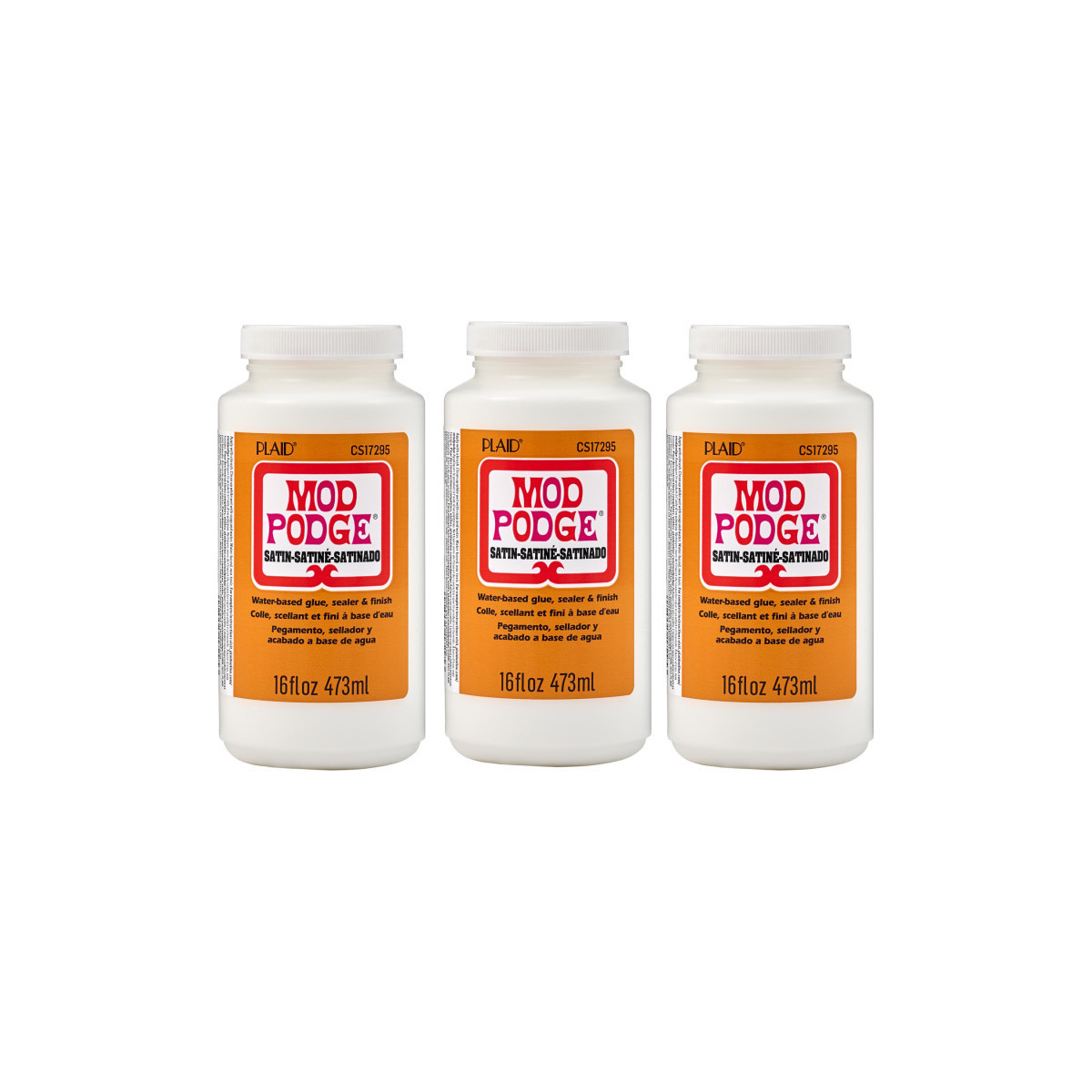 For over 55 years Mod Podge has been America's favorite glue, sealer, and finish. Mod Podge Satin is quick-drying and dries clear, leaving a smooth, satin finish. Preserve the beauty of your decoupage paper projects and more with this multi-purpose, all-in-one sealant, glue, and finish. Use this decoupage glue to create decoupage tissue paper projects as well as projects using wood, fabric, plastic, and canvas! This handy decoupage glue comes in a variety of other finishes such as gloss, matte, glitter, outdoor, dishwasher safe, and many other unique formulas for every project. Let your creativity come alive with the limitless possibilities of Mod Podge Satin. Sold as a pack of three 16 oz. bottles.