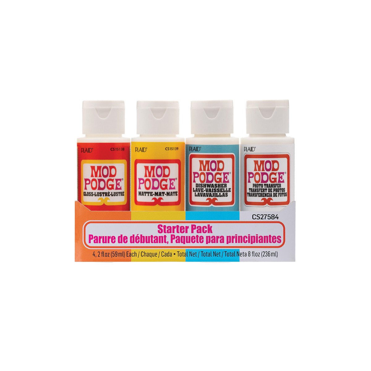 Add versatility and durability to your craft supplies with the 4-piece Mod Podge Starter Set. This handy set includes some of your favorite Mod Podge products including Mod Podge Matte, Gloss, Dishwasher Safe, and Photo Transfer Medium. For over 55 years Mod Podge has been America's favorite glue, sealer, and finish. This set is sure to be a must-have for all your decoupage projects. From mugs to paper crafts and more, preserve the beauty of your decoupage paper projects with this multi-purpose set. Mod Podge Matte has a smooth, matte finish, Mod Podge Gloss dries to a glossy finish, Mod Podge Dishwasher Safe dries to a hard, glossy finish, and Mod Podge Photo Transfer allows you to transfer color and black-and-white photocopies to any decoupage project. Use this decoupage glue to create decoupage projects on wood, glass, fabric, metal, canvas, and more. Let your creativity come alive with the limitless possibilities of the 4 piece Mod Podge Starter Set! Each set includes four 2 oz. bottles.