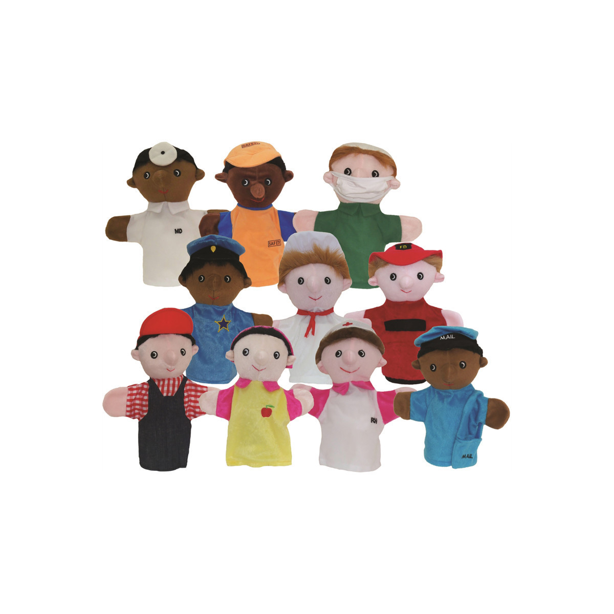These friendly community helpers help teach about safety, health and community. Multicultural characters have safe embroidered eyes and measure approximately 11". The puppets comfortably fit little or big hands. Set includes farmer, mailman, doctor, nurse, policeman, fireman, chef, safety engineer, teacher, and surgeon or dentist.