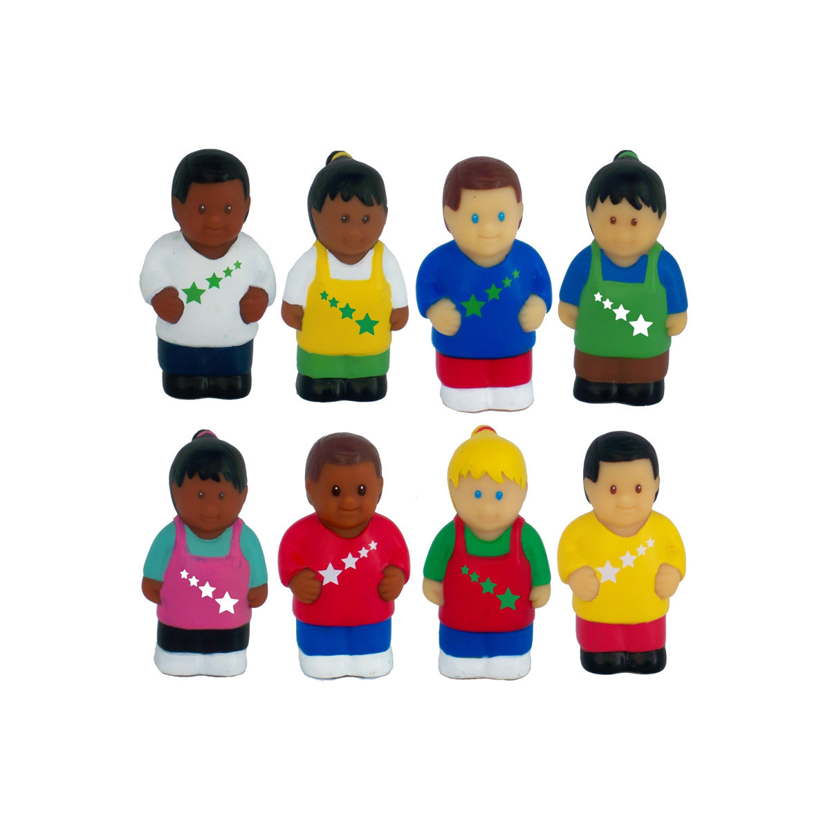 Set of 8 chunky 3" multicultural all-star children figures are soft and friendly. The characters help children learn about ethnicity and diversity through creative play. Develops hand and eye coordination. For ages 1+. Great for home, day care and preschool use.
