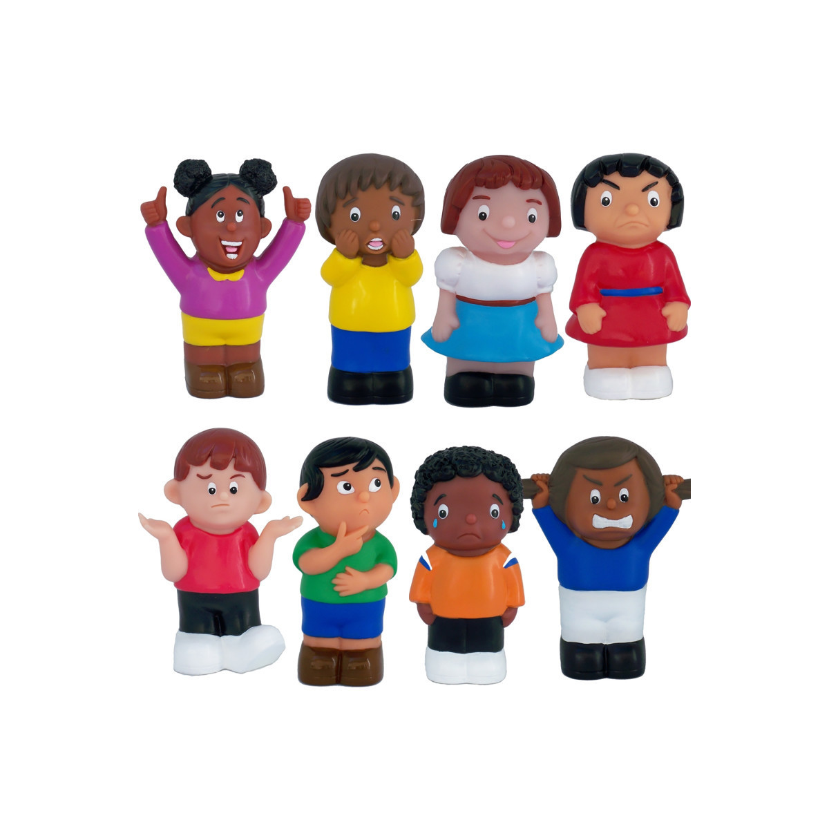 Set of 8 chunky 5.5" multicultural friends with feelings figures are soft and easy to relate to. The characters promote discussion and understanding of feelings and emotions in early childhood settings through creative play. Approximate size of each figurine is 5.5" x 2" x 2". Great for home, day care and preschool use.
