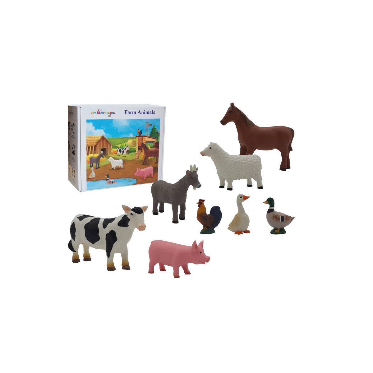 - Set of 8 includes horse, cow, pig, sheep, goat, duck, goose, and rooster.