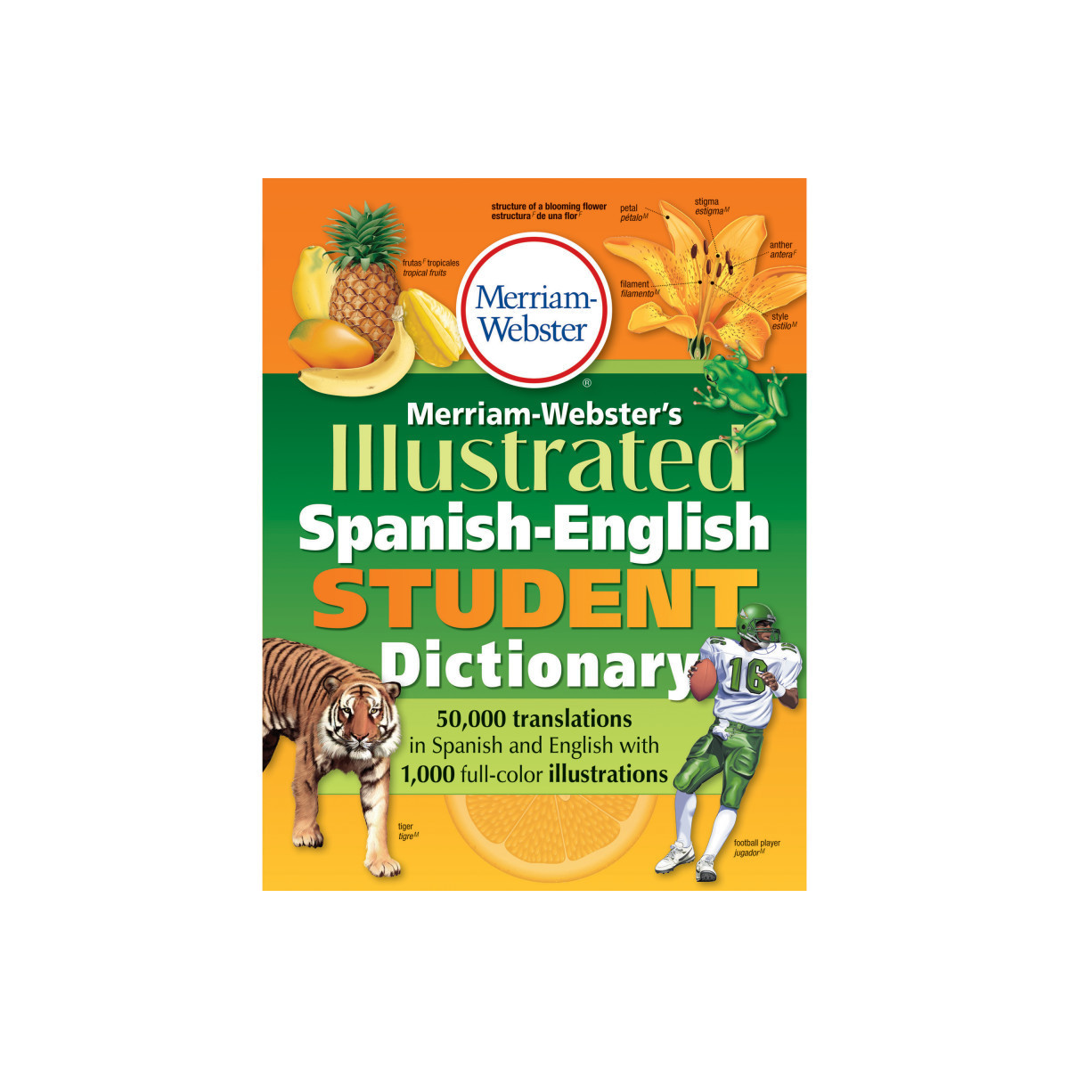 This durable, bidirectional dictionary (English to Spanish and Spanish to English) is a resource especially for students learning Spanish or English. More than 50,000 translations include variants, inflected forms, common phrases, synonyms, and definitions. An appendix with detailed pronunciation guides to the English words, includes IPA (International Phonetic Alphabet) and helps English learners speak the language. Special sections include the conjugation of regular and irregular Spanish verbs. 1,000 detailed drawings illustrate more than 10,000 additional terms and phrases that identify parts of the object in both English and Spanish. Perfect for use at school and home, and for students learning a second language. For grades 5-8, ages 10-14. Includes 496 pages. Measures 7.25" x 9.5". Flexi paperback binding.