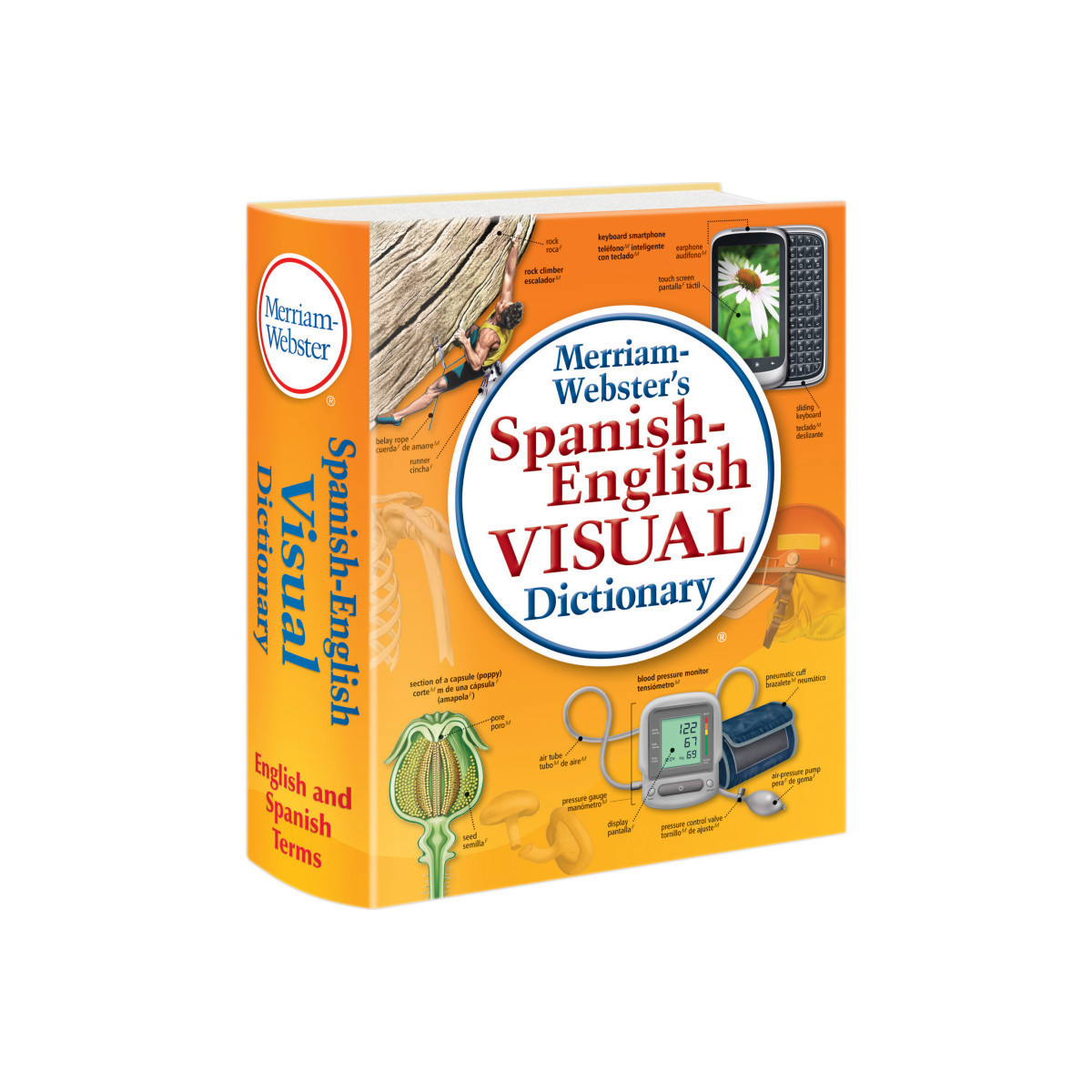 The Merriam-Webster's Spanish-English Visual Dictionary features more than 22,500 words and concepts in Spanish and English. More than 8,000 highly detailed, full-color illustrations with more than 22,500 up-to-date technical and everyday terms in both English and Spanish are organized by subject in specialized fields from all aspects of life. Chapters and corresponding themes include a wide variety of fields: astronomy, the earth, human beings, the animal kingdom, plants and gardening, house and do-it-yourself, arts and architecture, clothing, science and energy, sports and games, and much more. A valuable vocabulary-building resource and language-teaching tool that is perfect for work, school, self-study, travel, or simply browsing. Includes 1152 pages. Measures 6.125" x 7.875". Flexi paperback binding.