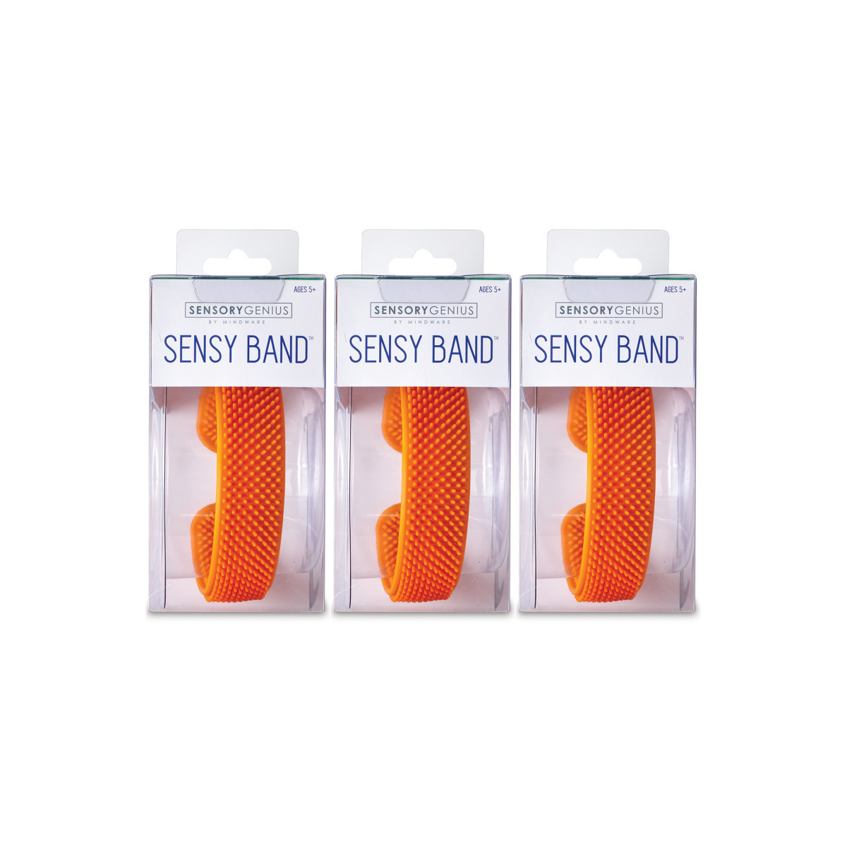 The Sensory Genius line allows busy hands to be productively active so the mind can focus. The Sensy Band's soothing textured silicone is the secret behind it's ability to calm and focus the mind. The bright orange band is easy to "slap" on and take off and adjusts to any wrist size. When not worn the Sensy Band is fun and satisfying to bend and curl. The soft silicone bristles are irresistible to the touch. Ages 5+. Pack of 3 Sensy Bands.