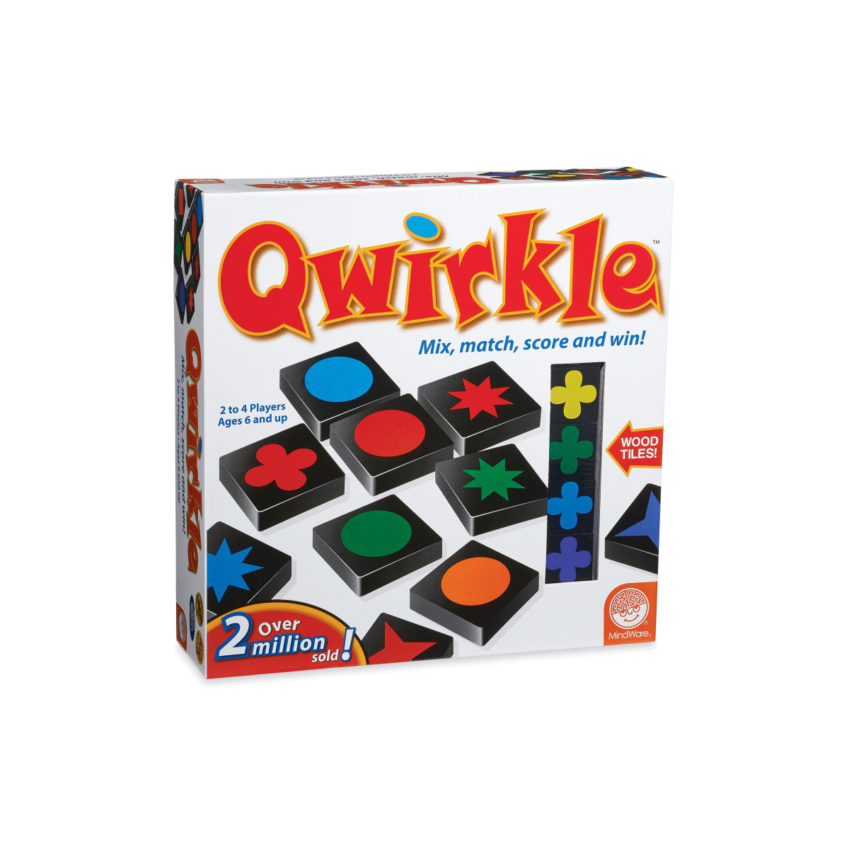 Qwirkle is as simple as matching colors and shapes, but this game also requires tactical maneuvers and well-planned strategy. Earn points by building rows and columns of blocks that share a common shape or color. Look for opportunities to score big by placing a tile that touches multiple pieces with matching attributes. The player with the most points wins! 108 wooden blocks. 2 to 4 players.