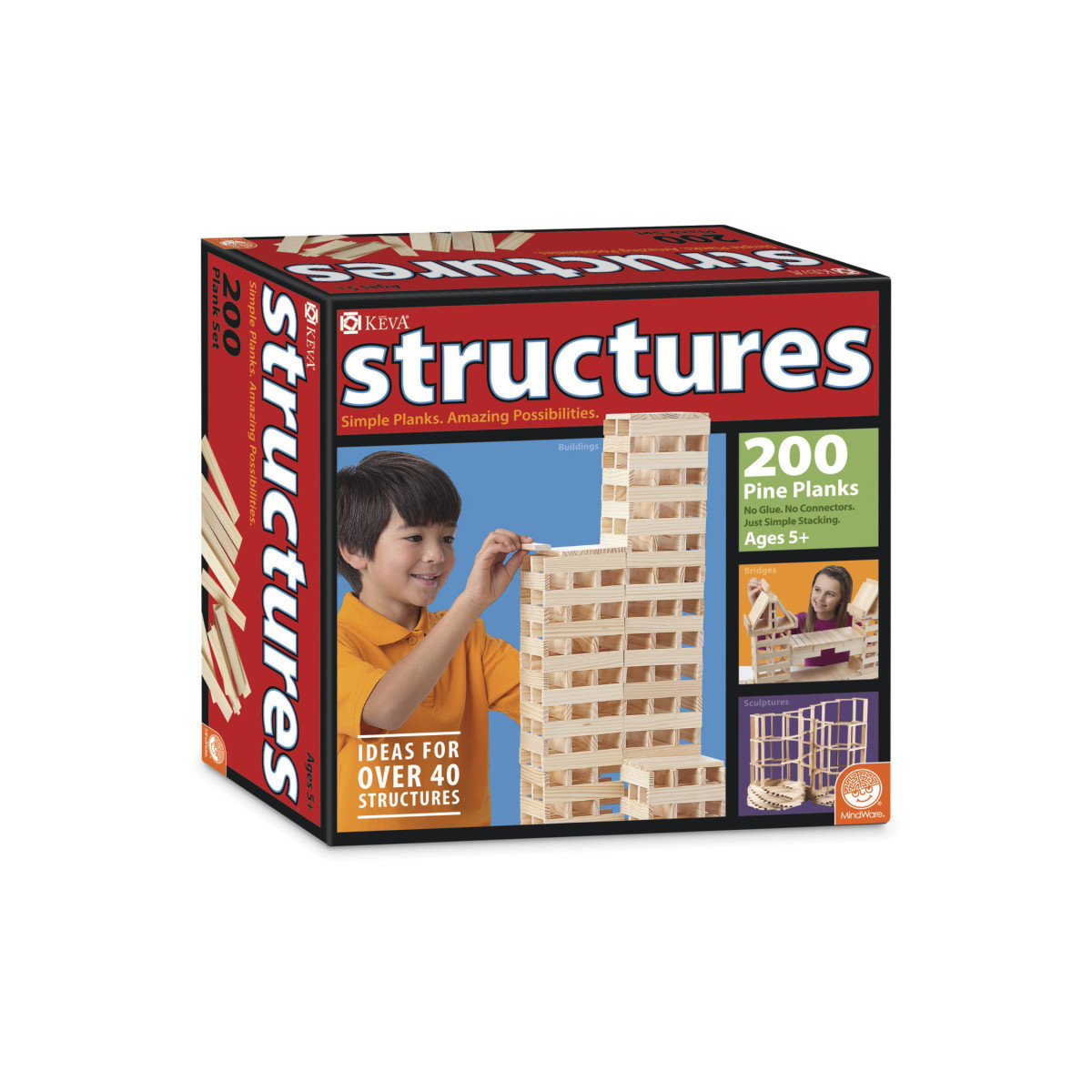 No glue or connectors required...simply stack the precision-milled, solid pine KEVA planks to create buildings, monuments and geometric forms. Its the ideal activity to help kids gain an understanding of balance and proportion, as well as an interest in architecture, building and design. A 24-page, full-color idea booklet with build-out instructions is also included. Compatible with the larger, 400-Plank KEVA Structures Set (not included). Ages 5 and up.