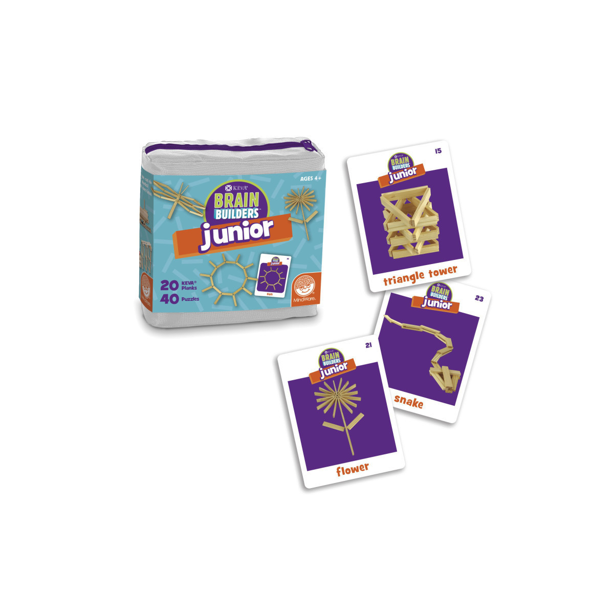 - KEVA® Brain Builders Junior is a great first step towards STEM. Features photos of fun, recognizable objects to replicate for those 4 and up.
