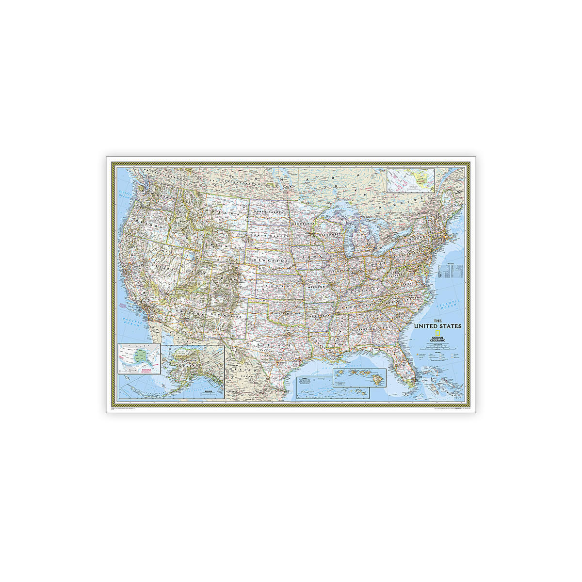 Expertly researched and designed, National Geographic's United States wall map is the standard by which other reference maps of the U.S. are measured. Signature Classic styling with bright, easy to read color palette with blue water and colorful state borders. All 50 states with insets for Hawaiian Islands and Alaska plus inset showing relative size of Alaska. Clearly defined state and country boundaries, cities, islands, national parks, and physical features. Thousands of place names carefully and artfully placed to maintain legibility in heavily populated areas. Background shows mountain ranges and valleys in subtle shaded relief with mountain ranges labeled. Major water bodies including rivers, lakes, gulfs, bays, straits, and ocean bathymetry.