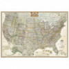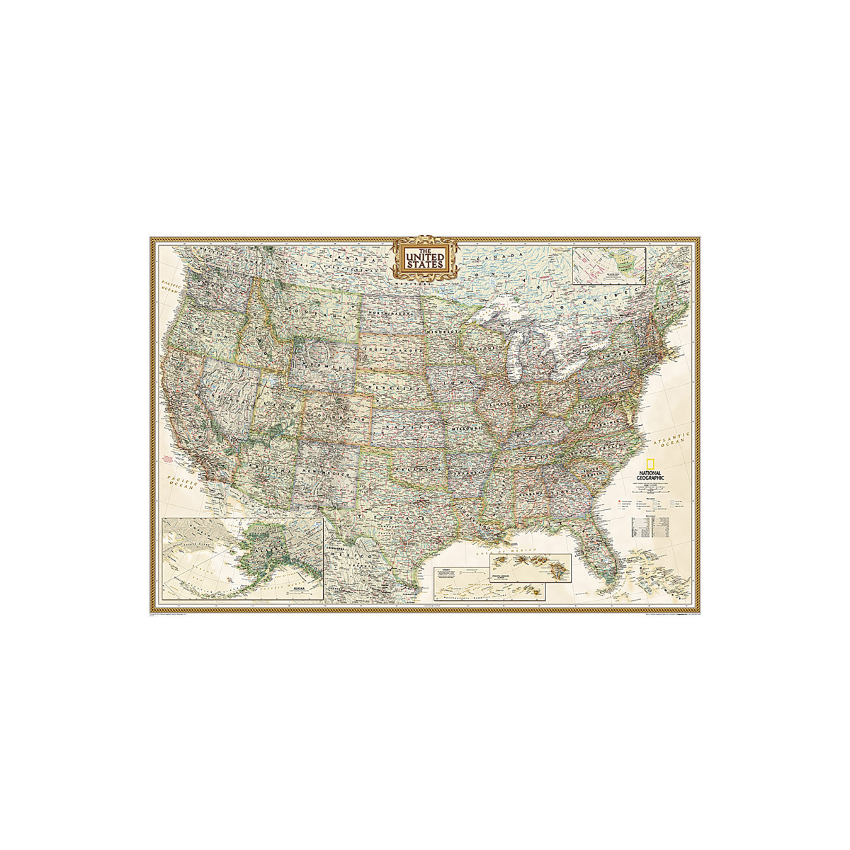 Expertly researched and designed, National Geographic's United States wall map is the standard by which other reference maps of the U.S. are measured. Antique-style "executive" color palette. All 50 states with insets for Hawaiian Islands and Alaska plus inset showing relative size of Alaska. Clearly defined state and country boundaries, cities, islands, national parks, and physical features. Thousands of place names carefully and artfully placed to maintain legibility in heavily populated areas. Background shows mountain ranges and valleys in subtle shaded relief with mountain ranges labeled. Major water bodies including rivers, lakes, gulfs, bays, straits, and ocean bathymetry.