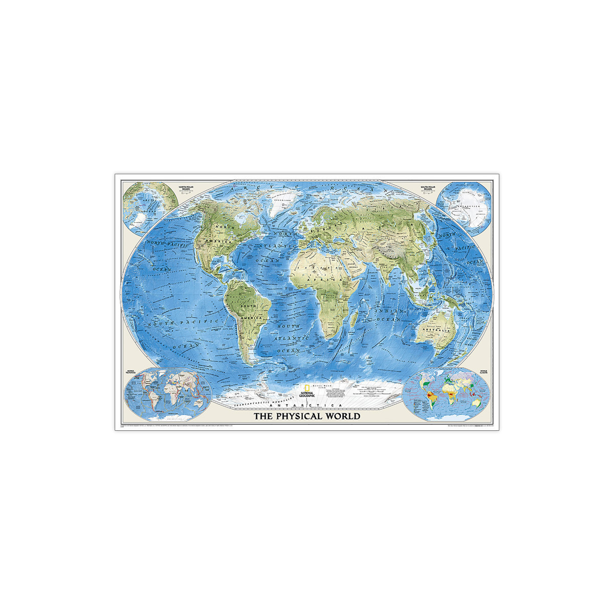 Expertly researched and designed, National Geographic's The Physical World map highlights the Earth's land and undersea forms with exquisite hand-painted relief. Drawn in the Winkel Tripel projection, distortions are minimized and unlike many other World maps, Greenland is show the same size as Argentina and not as the size of all of South America. Two corner inset maps show the Earth's crust and world climatic zones.