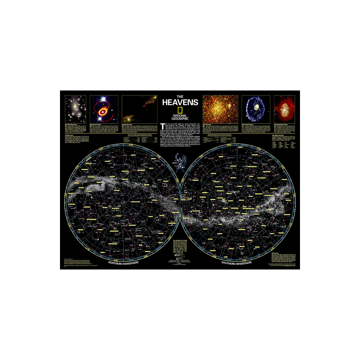 National Geographic's The Heavens shows star charts and constellations for both the Northern and Southern Hemispheres.
