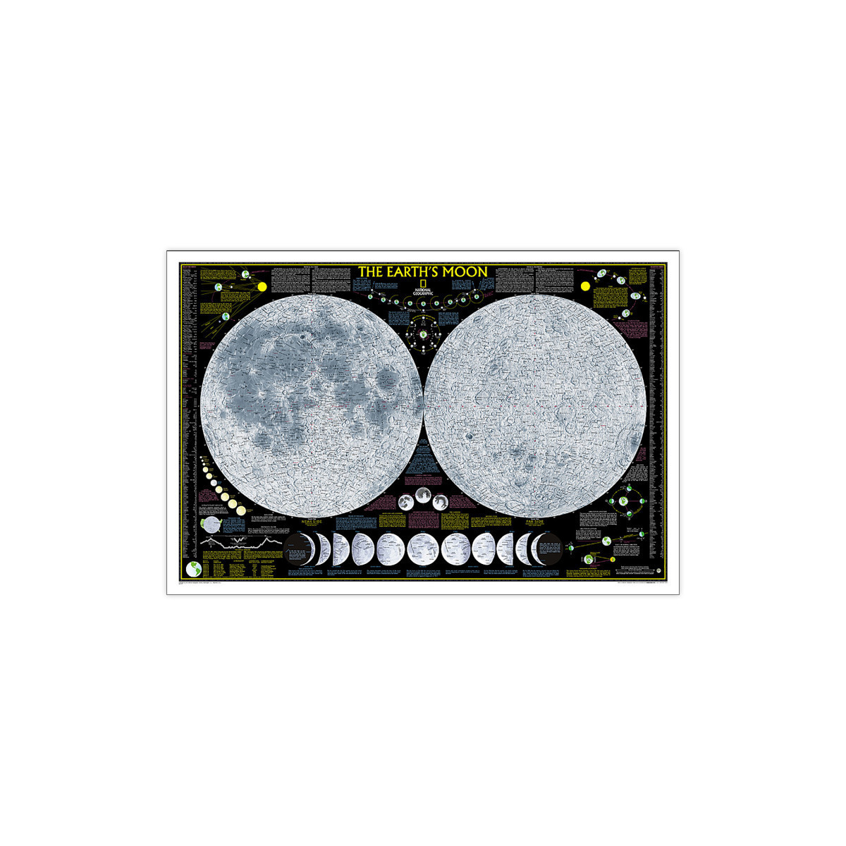 National Geographic's "The Earth's Moon" is like having an atlas and almanac in one. This incredibly informative wall map features detailed depictions of the entire surface of the moon with a selective index showing the named physical features. Diagrams show the moon's orbital paths, rotation around Earth, librations, how solar and lunar eclipses occur, and how the moon affects Earth's tides. The phases of the moon are detailed along with the features visible in each phase. Craters, mountain ranges, highlands, seas, rays, and other physical features are described, as are the moon's physical properties, moon lore, and more. Comparisons to the moons of other planets in our solar system and information on the Apollo Missions is included as well.