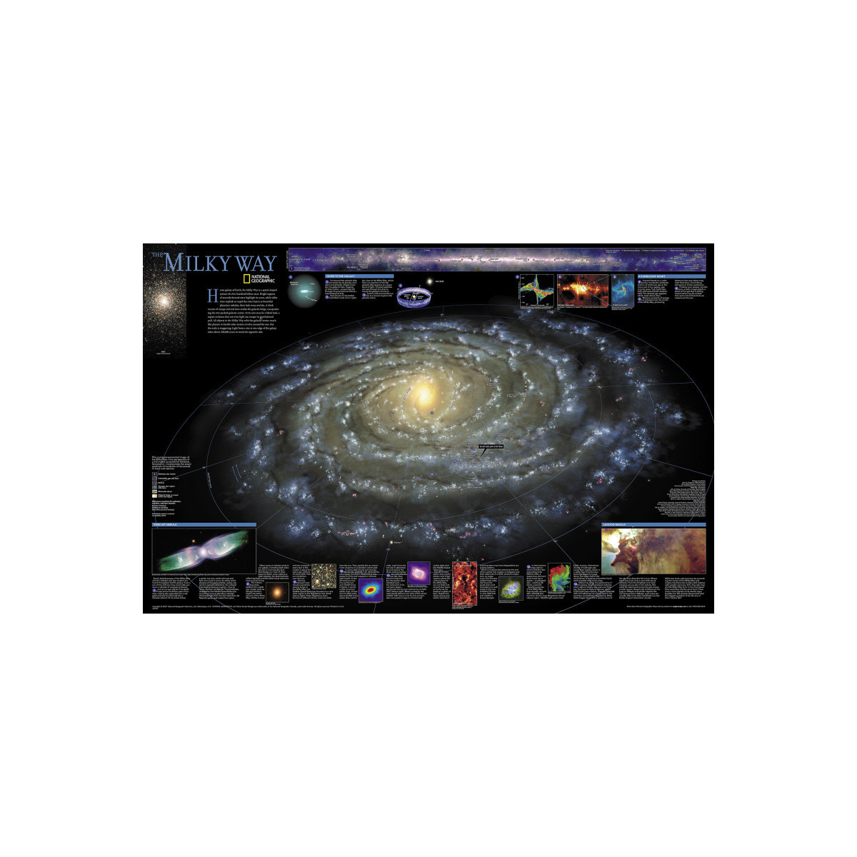 This computer-generated image of the Milky Way shows the entire galaxy in one perspective of a 3-D model compiled specially for National Geographic. The model incorporates the positions of hundreds of thousands of stars and nebulae within the galaxy, shows Earth's location, and includes additional photographs, descriptions and locations of fascinating phenomena throughout the Milky Way.