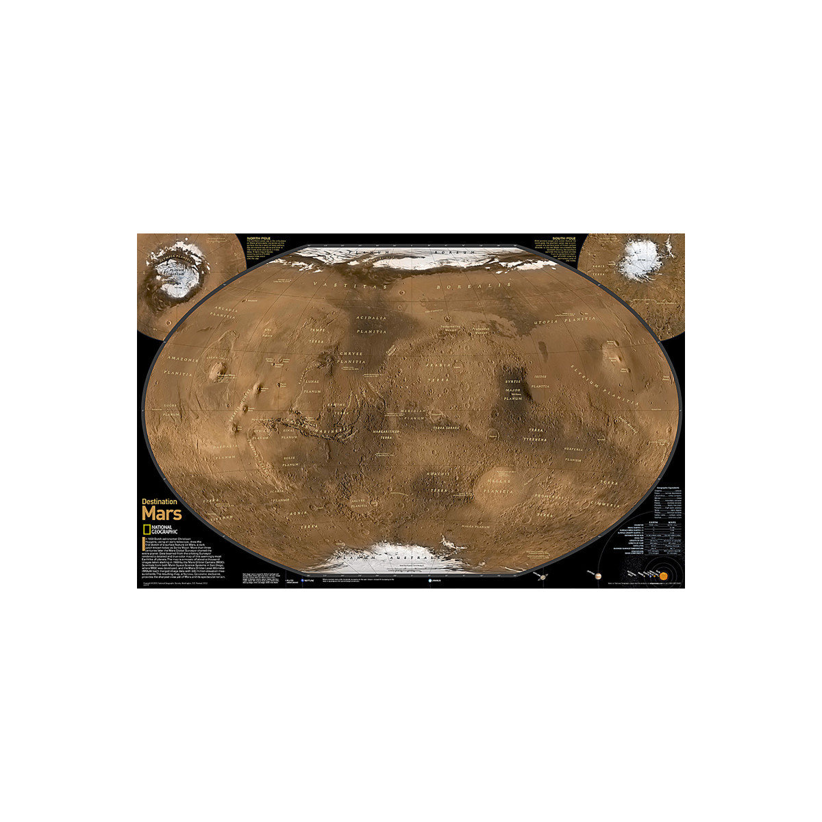 See Mars as it really looks, from the heights of Olympus Mons (nearly 70,000 feet above the surface), to ancient canyons, to Hellas Planitia, the lowest point on Mars, where a meteorite punched a hole in the surface 1,300 miles wide and five miles deep. Destination Mars was created for National Geographic with over 1,000 images taken by the Mars Orbiter Camera, and merged with 330 million elevation points to create the sharpest view yet of Mars and its spectacular terrain.