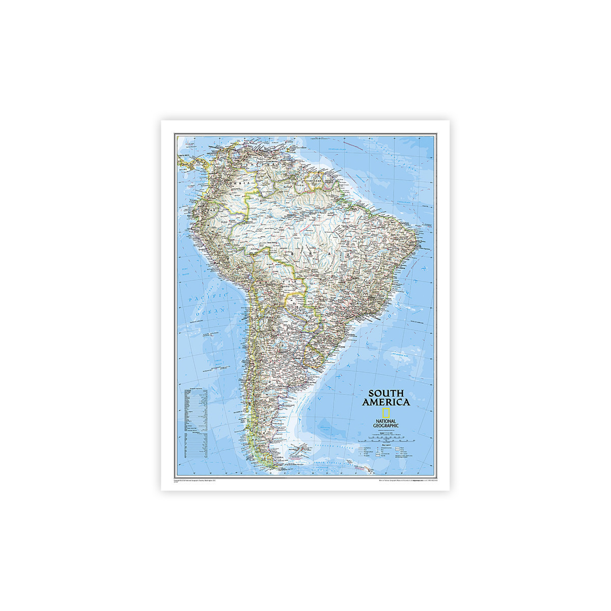 Ocean features and currents, as well as depth curves and soundings, add context to the continent's extensive coastline, offering insights into the diverse human populations that inhabit those shores. Coverage includes the countries and major cities of Argentina, Bolivia, Brazil, Chile, Colombia, Ecuador, Guyana, Paraguay, Peru, Suriname, Uruguay, and Venezuela, providing a comprehensive overview of the region's diverse territories. Encapsulated in heavy-duty 1.6 mil laminate, this map is resistant to changes in humidity, ensuring long-lasting durability. Whether you're exploring the bustling streets of Buenos Aires or the majestic landscapes of the Amazon, the National Geographic South America Classic Map, laminated for reliability, is your essential guide to the wonders of South America.