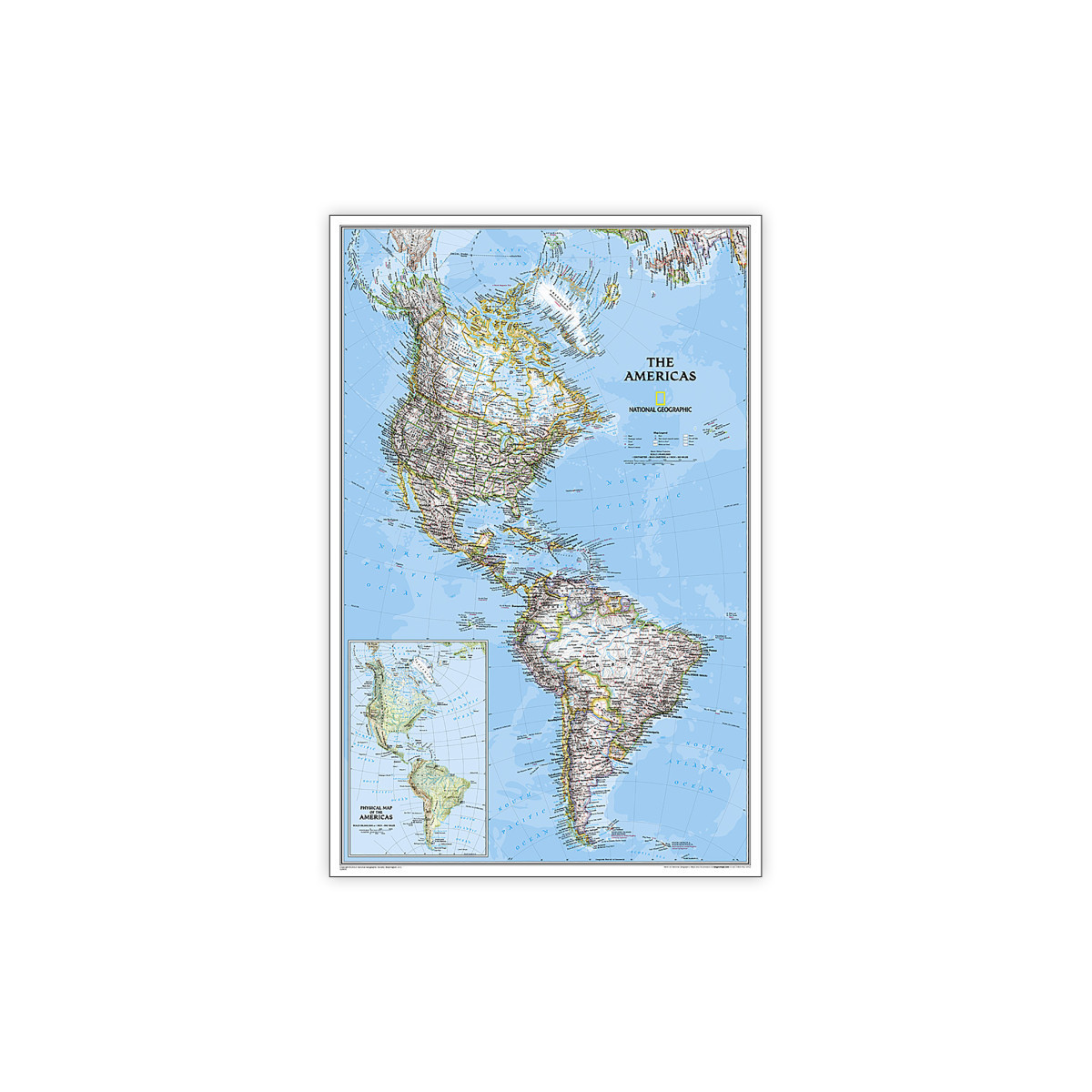 Coastal bathymetry is shown with depth curves and soundings, providing insights into the underwater topography of the region, while symbolism for water features and other landforms enhances understanding of the continent's diverse geography. An inset physical map of The Americas provides additional detail and context, enriching the viewer's exploration of the continent. Encapsulated in heavy-duty 1.6 mil laminate, this map is resistant to changes in humidity, ensuring long-lasting durability. Whether you're a student, traveler, or geography enthusiast, the National Geographic The Americas Classic Map, laminated for reliability, is an indispensable tool for exploring the wonders of The Americas.