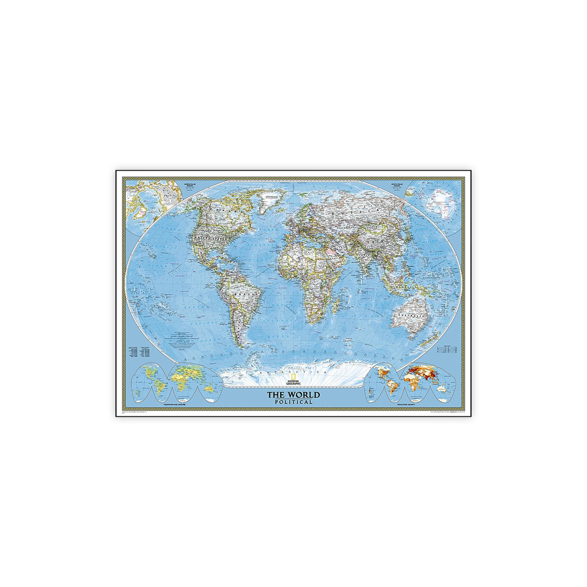 From the towering peaks of the Himalayas to the sprawling coastlines of the Pacific, every geographic feature is depicted with precision, thanks to the subtle shaded relief and meticulously labeled landforms. Major water bodies, including rivers, lakes, and oceans, are clearly delineated, while accurately defined international boundaries, cities, islands, and airports provide essential geographic context. Thousands of place names are strategically placed to ensure legibility, even in heavily populated areas, offering a comprehensive overview of the world's rich tapestry of cultures and landscapes. Drawn in Winkel Tripel projection, distortions are minimized, providing a more accurate representation of the Earth's surface. Corner inset maps offer additional insights into vegetation, land use, population density, and the polar regions, enriching the viewer's understanding of global patterns and phenomena. Up-to-date international boundaries and territorial control reflect de facto status on the ground. Printed on tear-resistant, coated paper for strength and color protection, this mural map is built to last, with a dirt and dust-resistant coating that can be easily cleaned with a damp cloth. The mural can be hung using heavy duty (clay based) wallpaper paste. Whether you're a student, traveler, or geography enthusiast, the National Geographic World Classic Map, in mural format, is an indispensable tool for unraveling the mysteries and marvels of our planet.
